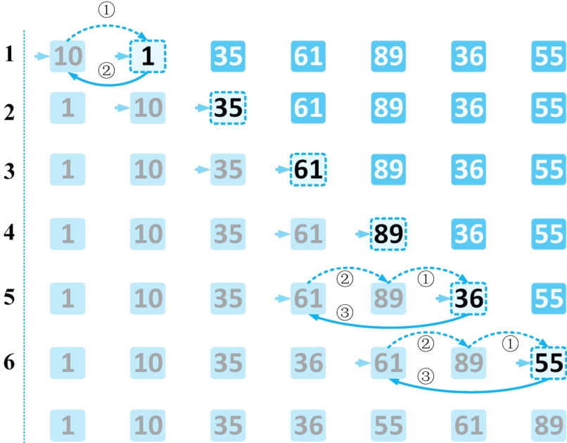 第五趟排序:起始位置 i =5,首元素值key=36,自有序区尾部向头部比较,key<89、key<61、key>35,89和61依次向后移动一个位置。此时,原61所在的下标位置3即为key的最终位置,将key移到该位置。合并key至有序区后,有序区 d ={1,10,35,36,61,89},无序区 r ={55}。