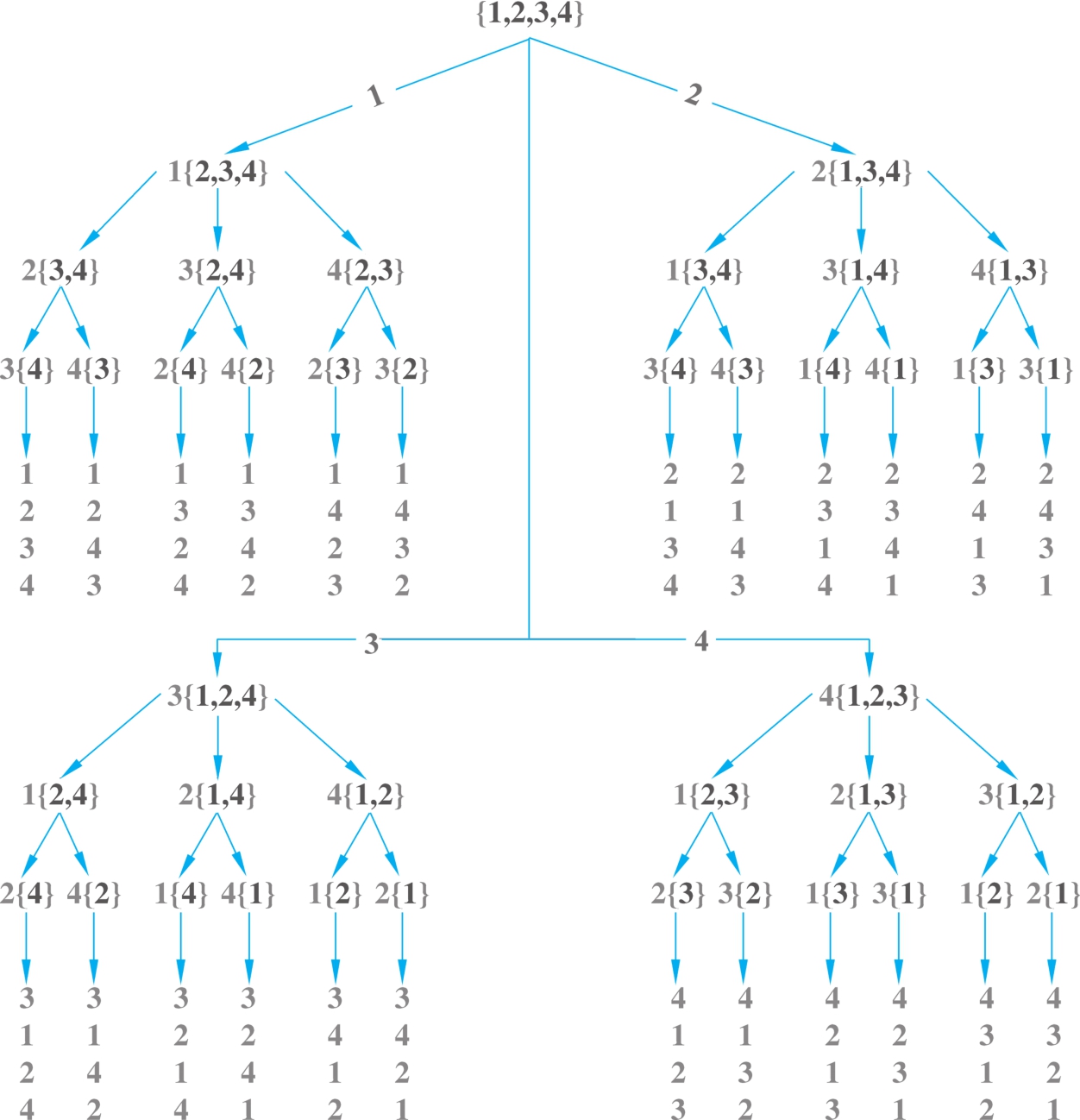 (1)先取出集合中的第1个元素 s 1 作为排列第1位,将其余的 n -1个元素 S n -1 ={ s 2 , s 3 ,…, s n }进行全排列。之后,分别将集合中第2个元素 s 2 ,第3个元素 s 3 ,…,第 n 个元素 s n 与 s 1 交换位置,求解剩余 n -1个元素构成的全排列。如图3-2所示,先取 s 1 =1,将其作为排列结果的第1位,然后求解由{2,3,4}构成的全排列;将 s 2 =2与 s 1 =1交换位置,将 s 2 =2作为排列结果的第1位,然后求解由{1,3,4}构成的全排列;以此类推,分别将 s 3 =3和 s 4 =4与 s 1 =1交换位置,求解对应的全排列。