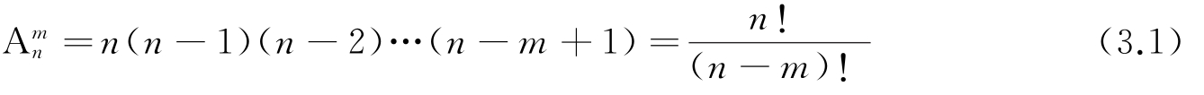 排列就是将元素(或符号)按照确定的顺序进行重排,重排后的每一个顺序称为一个排列。例如,对于元素集 S ={1,2,3}而言,可获得6个排列 p 1 =(1,2,3), p 2 =(1,3,2), p 3 =(2,1,3), p 4 =(2,3,1), p 5 =(3,1,2), p 6 =(3,2,1)。从 n 个不重复元素中任取 m 个元素,这 m 个元素构成的所有不同排列的个数称为排列数,记为A m n 或 A ( n , m ),计算公式如式(3.1)所示。