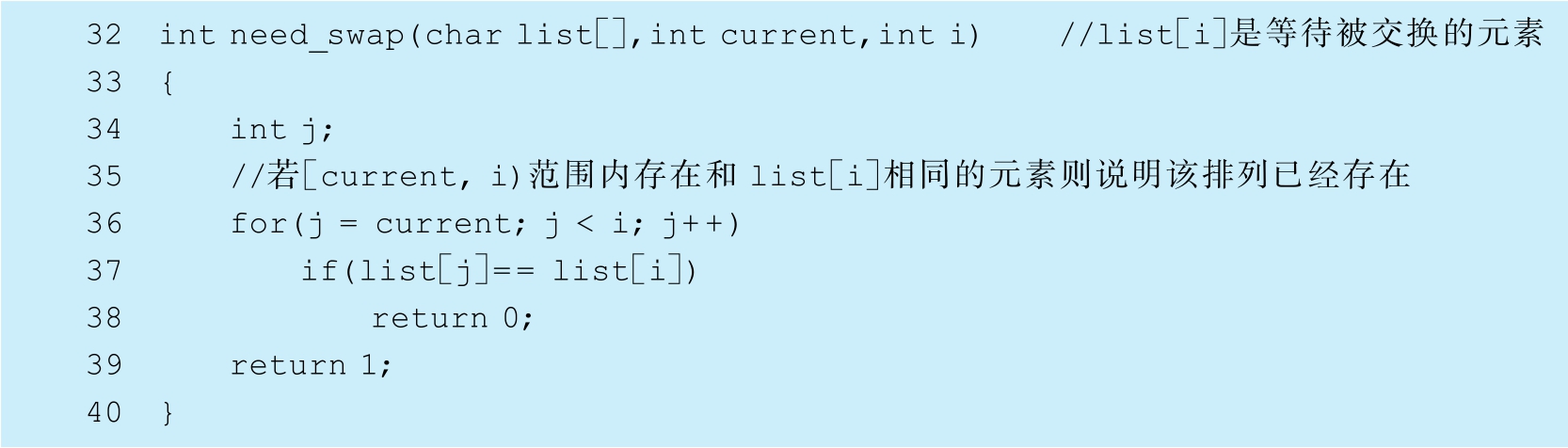 need_swap()函数用于判定当前元素与之前的元素间是否存在重复,是实现消除重复全排列的关键。该函数有3个参数,list[]、current和i,作用和意义与朴素全排列函数native_all_perm()相同。去重全排列的根本在于当前元素只需要与它前面出现的非重复字符交换。因此,need_swap()函数增加了判断条件,判定两个待交换元素的值是否相同,若相等则表示元素值重复无须交换,不相同则应进行交换。