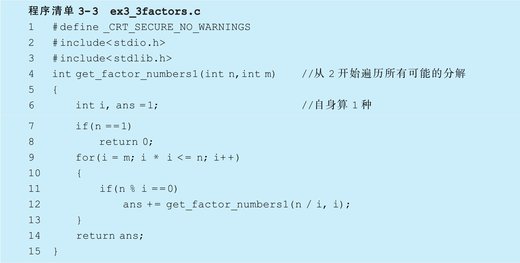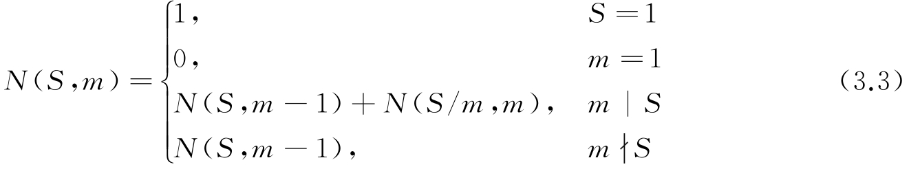 第2种分解方法主要是通过对问题的分析,获得子问题的表述,根据递归表达式来进行求解。3.3.1节通过试除法,利用 之间的因子获取某个分解。也可以从 S 出发,以因子递减方式逐步尝试对 S 及其因子进行分解,最终基于解的加法原理获得 S 的各个分解。 S 的分解因数问题 N S m )的递归表达式如式(3.3)所示。