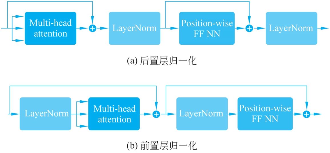 层归一化相对于残差连接的放置方式有两种:一种是后置层归一化(post layer normalization),将层归一化放在残差连接之后;另一种是前置层归一化(pre layer normalization),将层归一化放在残差连接之前。这两种放置方式如图2.6 [8] 所示。