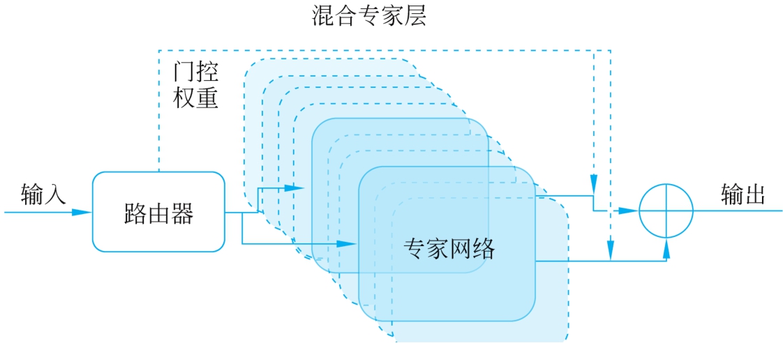 MoE层由一个门控网络和一组专家网络组成,如图2.8所示。对于一个输入,MoE层的输出是几个专家网络的输出的加权和。专家网络的权重由门控网络确定。