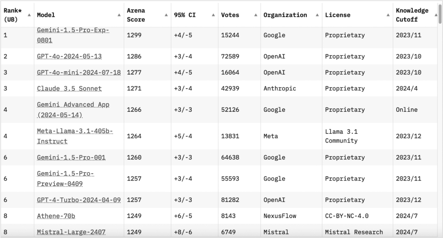 图1.4 LMSYS Chatbot Arena排行榜(2024年8月8日)
