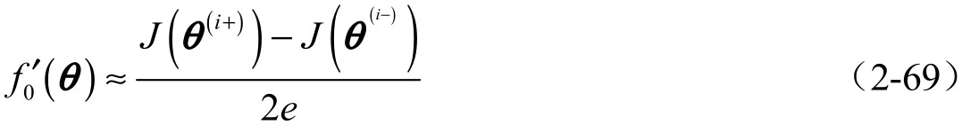 其中, e 是一个小的数值(通常在1×10 -5 左右)。 J ( θ ( i +) )表示在进行前向传播时,给定输入的情况下,参数 θ 的第 i 个元素被扰动+ e 时计算的误差。 J ( θ ( i -) )表示在相同输入情况下,参数 θ 的第 i 个元素扰动- e 时计算的误差。因此,通过两次前向传播,可以近似计算模型中任何给定参数元素的梯度。这种数值梯度的定义直接来源于导数的定义。虽然这种数值梯度计算方法比较精确,但是每次计算单个元素的梯度都需要在网络中进行两次前向传播,计算代价非常高。因此,这种方法通常仅用于验证梯度的正确性,在实际训练中并不使用。