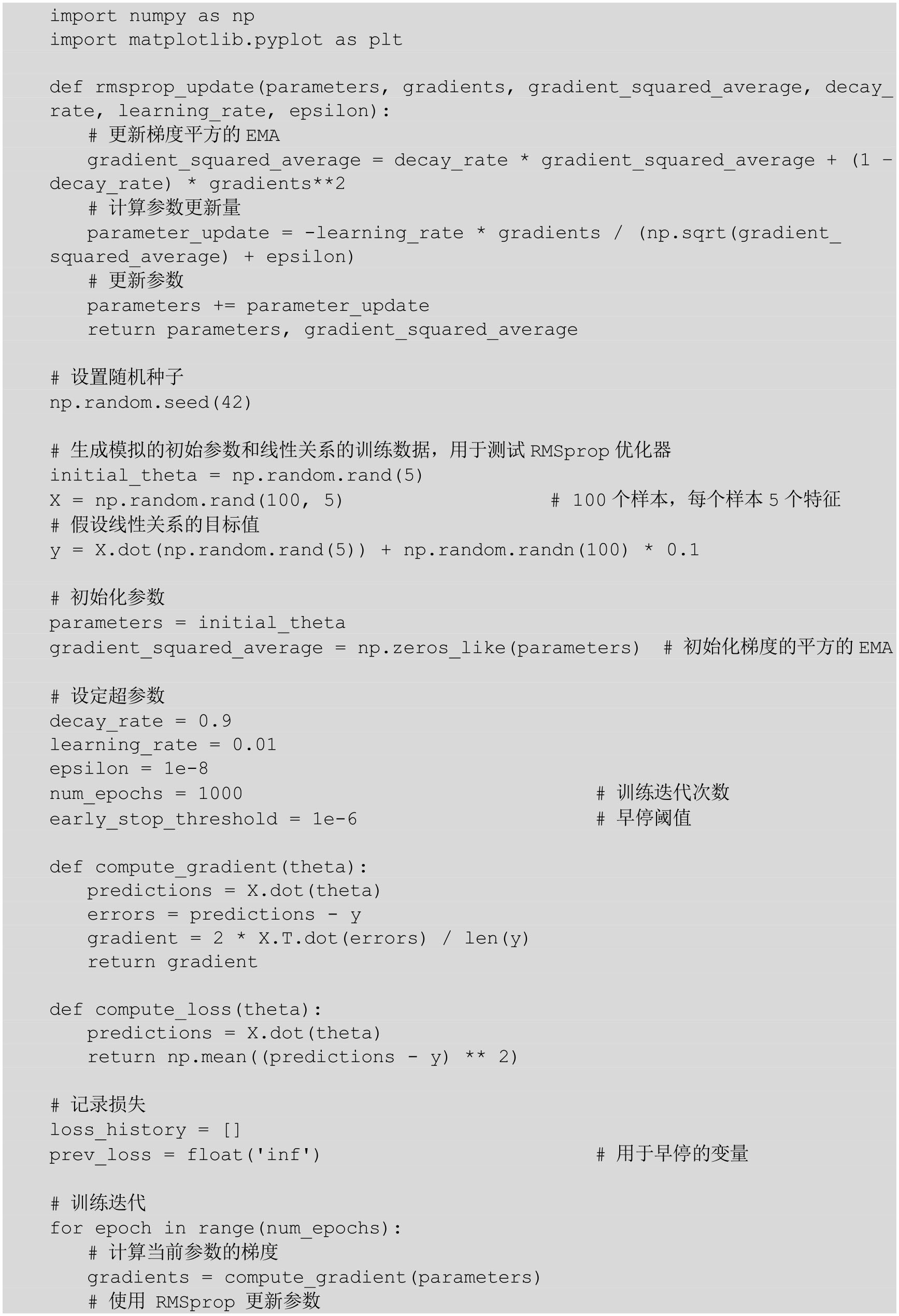 RMSprop和Adadelta在全局学习率和参数更新量的处理上存在显著差异。在全局学习率方面,RMSprop依赖于一个全局学习率,并通过梯度的均方根(RMS)估计对学习率进行缩放,而Adadelta则无须手动设置全局学习率,而是通过参数更新量的均方根动态调整步长,实现完全自适应的学习率调整。在参数更新量的平滑方面,RMSprop仅对梯度的平方进行平滑,直接使用计算得到的更新步长。而Adadelta则对梯度的平方和参数更新量的平方同时进行平滑,从而使更新步长的缩放更加稳定,提升了模型训练的健壮性。