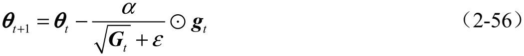 由于 G t 包含对所有参数 θ 的过去梯度的平方和,现在可以通过执行 G t 和 g t 之间的逐元素矩阵-向量乘法(用符号⊙表示)来向量化实现: