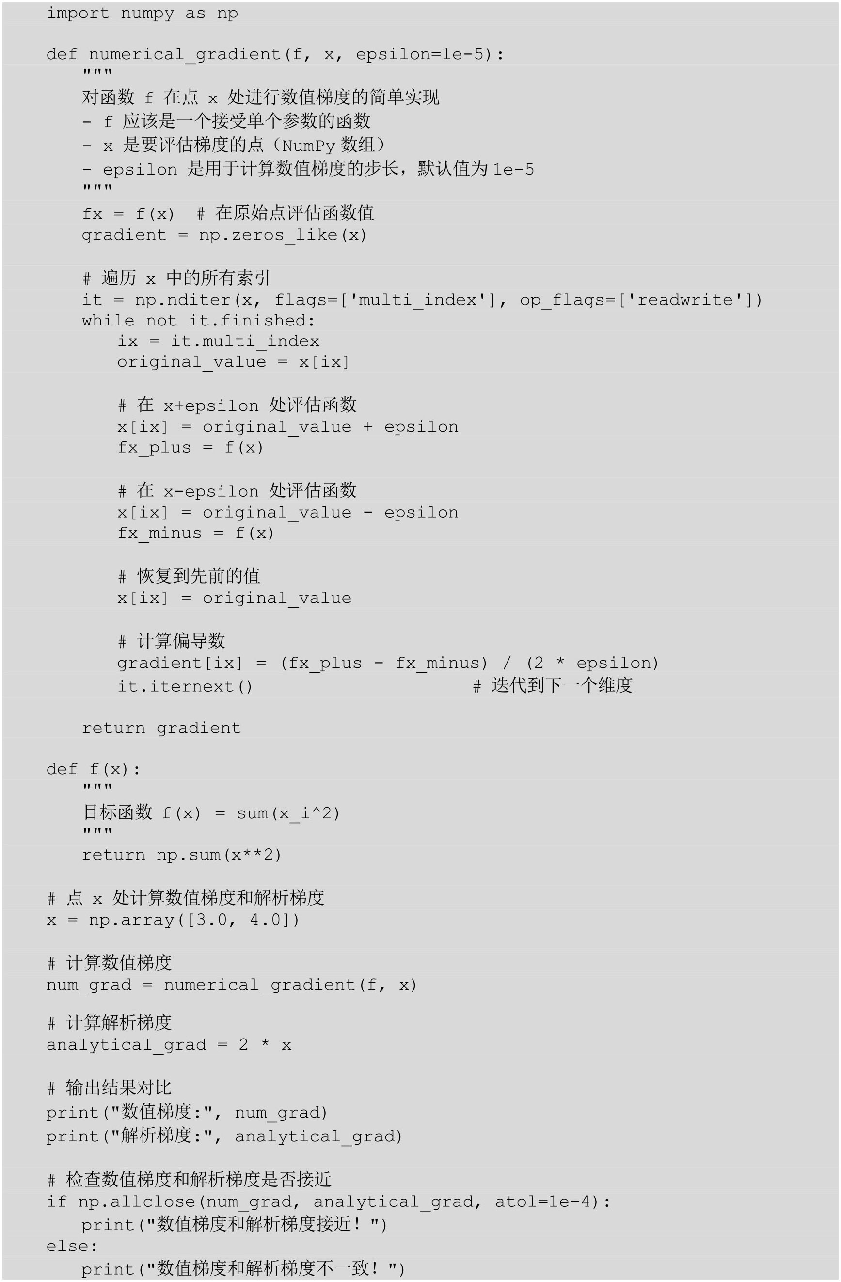 在了解了神经网络的基本结构之后,还需要确认它的计算是否正确,尤其是梯度的计算。为此,可以使用一种叫作“数值梯度检验”的方法来验证模型中的梯度是否正确。这个方法的原理是:通过对参数进行非常小的变化,计算出损失函数的数值导数,再将这个数值导数与神经网络中计算出的梯度进行比较。如果两者相近,则说明梯度的计算是正确的。