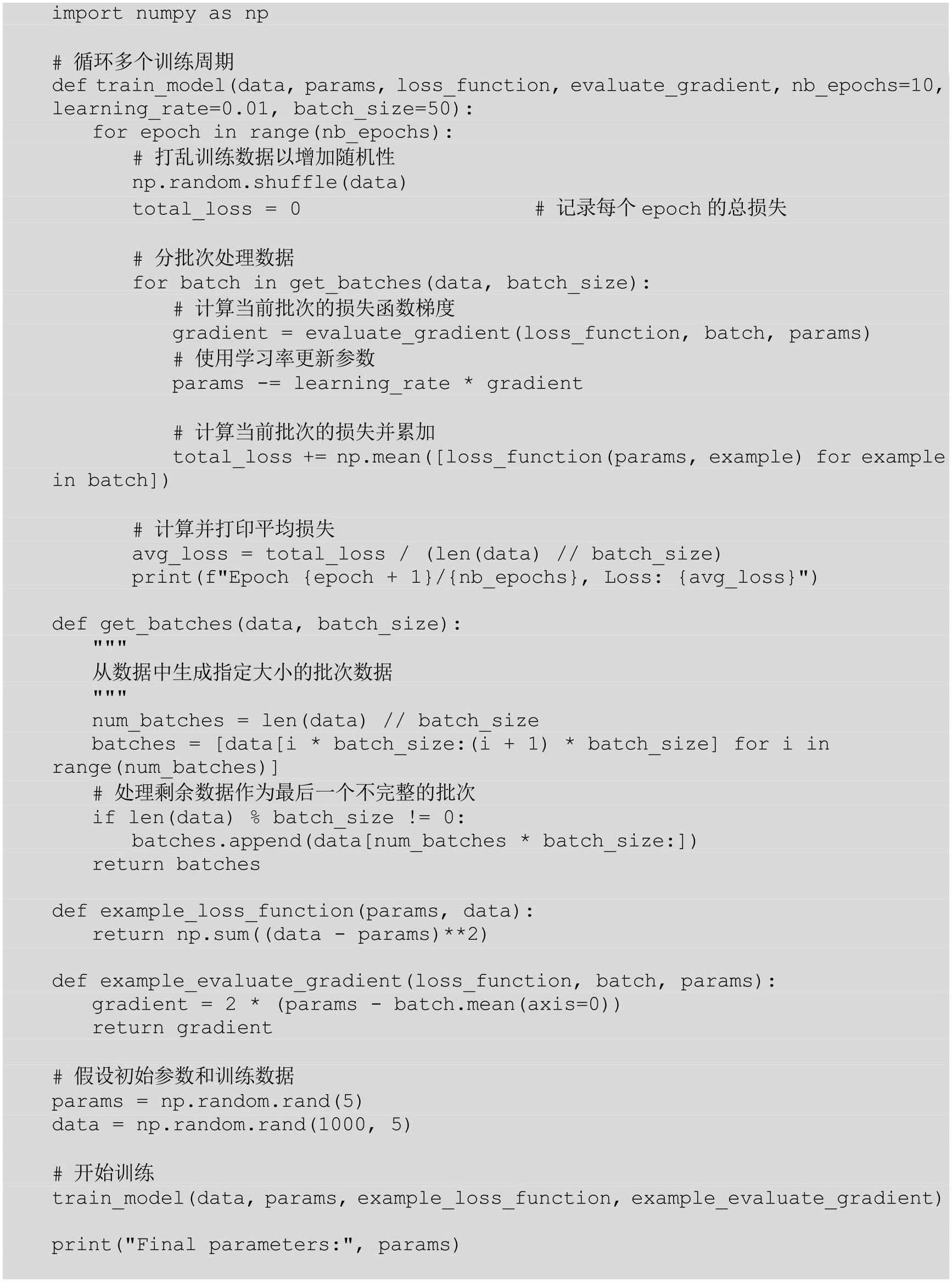 假设有一个包含3个参数的模型,即 d =3。在时间步 t =1时,每个参数 θ 1 、 θ 2 和 θ 3 的梯度分别为2、3和1。那么 G 1 就是一个对角矩阵,其对角线上的元素为这些梯度的平方和,即对角线元素分别为2 2 、3 2 和1 2 。因此, G 1 是一个3×3的对角矩阵: