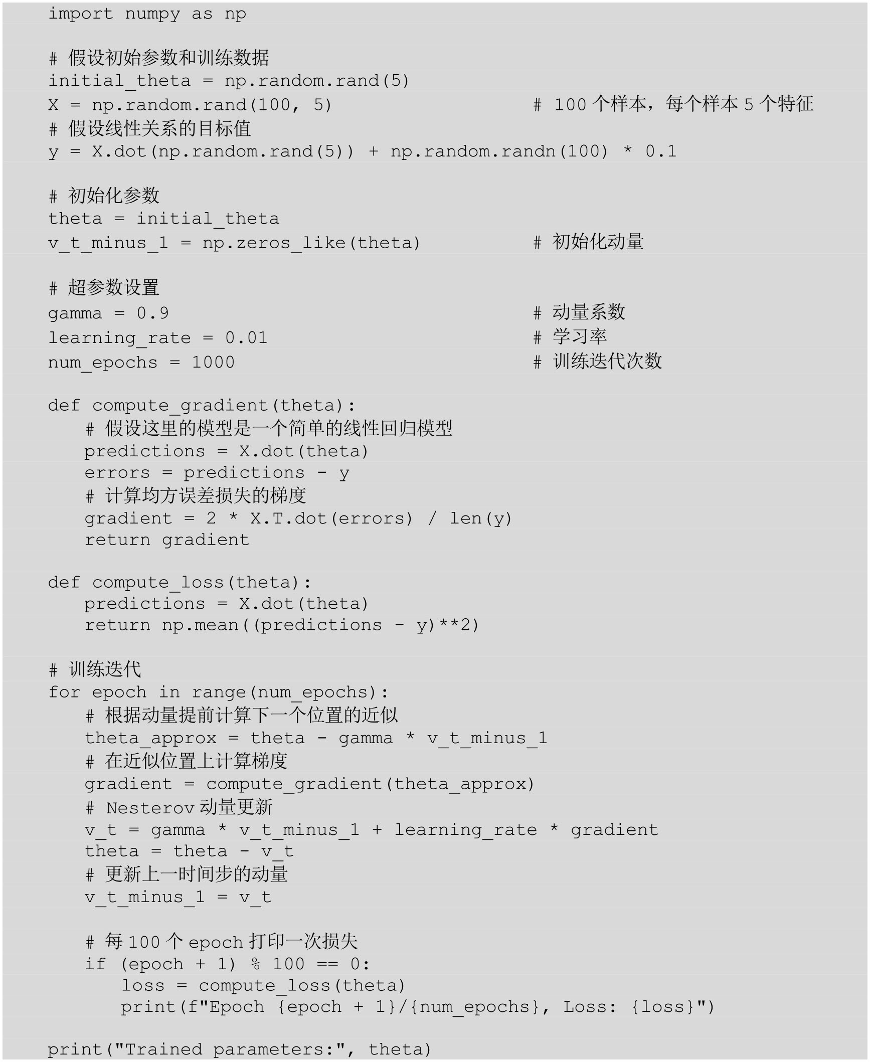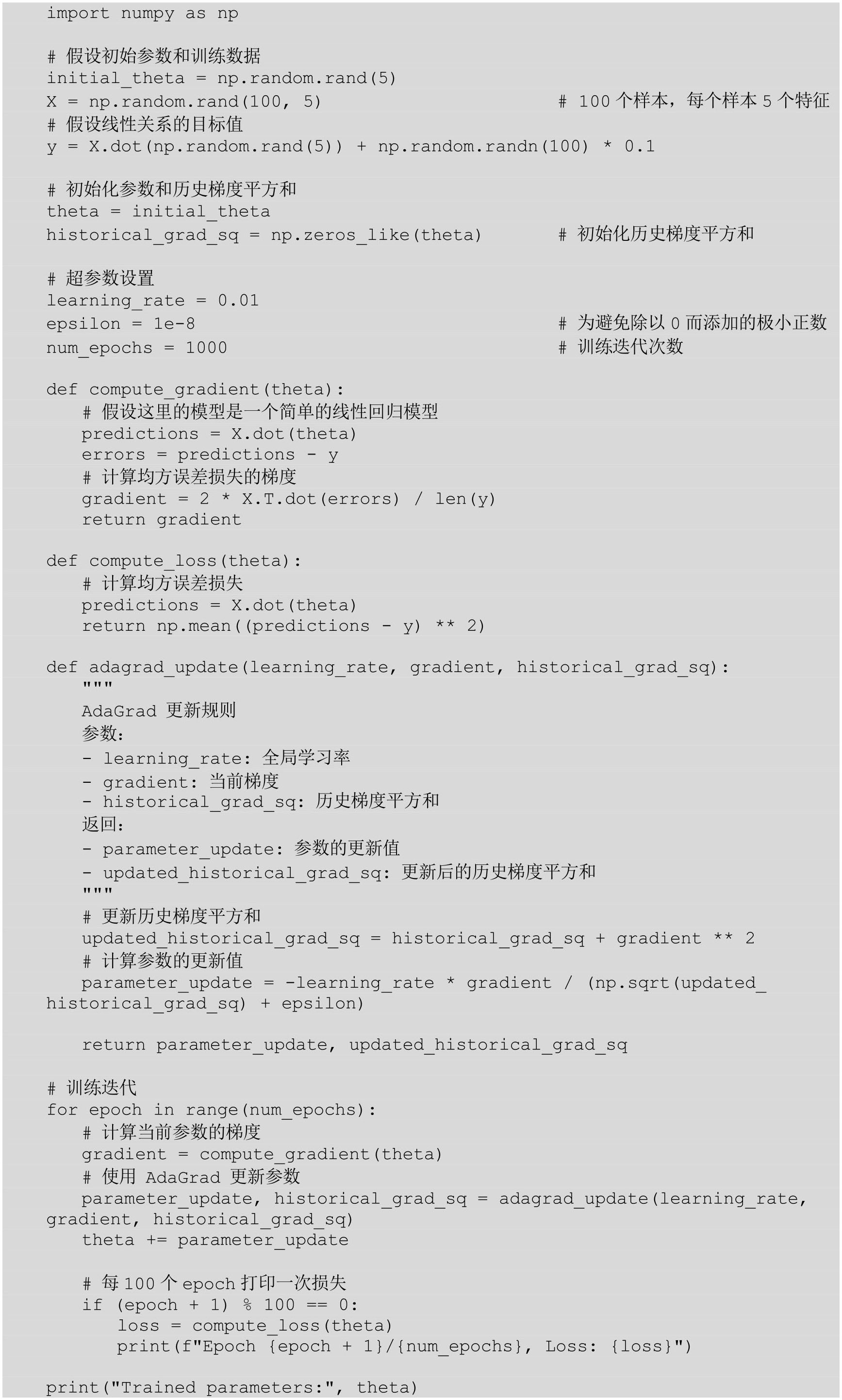 假设有一个包含3个参数的模型,即 d =3。在时间步 t =1时,每个参数 θ 1 、 θ 2 和 θ 3 的梯度分别为2、3和1。那么 G 1 就是一个对角矩阵,其对角线上的元素为这些梯度的平方和,即对角线元素分别为2 2 、3 2 和1 2 。因此, G 1 是一个3×3的对角矩阵: