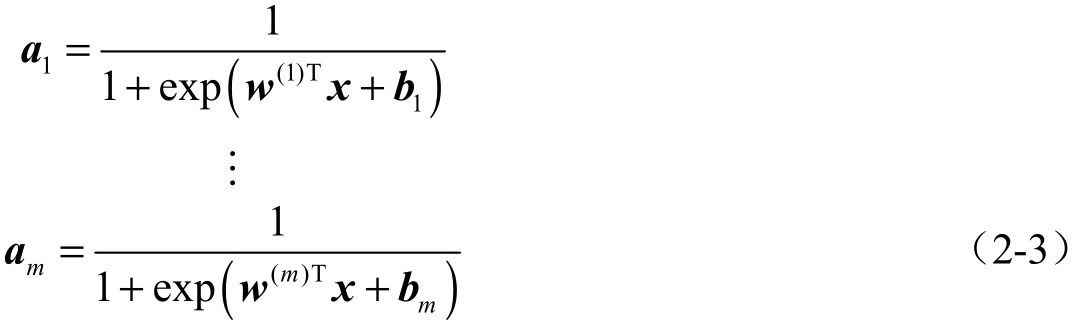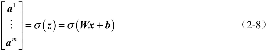 如果将不同神经元的权重表示为{ w (1) ,…, w ( m ) },将偏置表示为{ b 1 ,…, b m },可以将相应的线性组合激活为{ a 1 ,…, a m }: