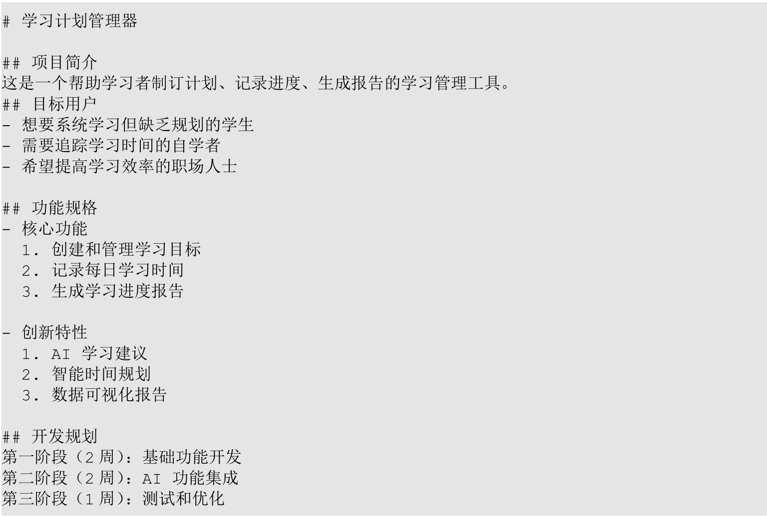 下面通过一个学习计划管理应用的例子,来看看如何把这个框架变成实际的文档。