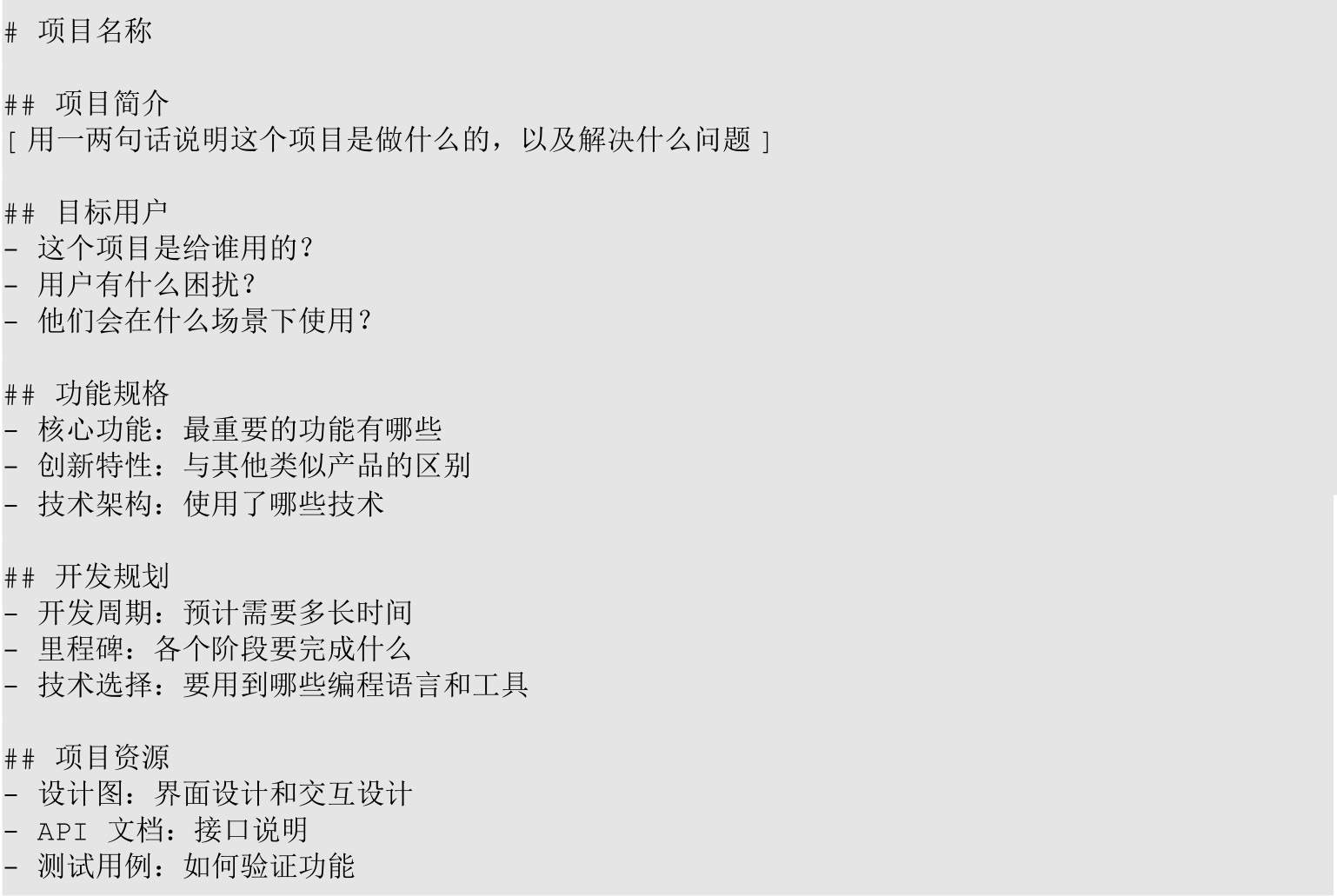 当项目开始变得复杂时,仅仅用一句话描述需求可能就不够用了。就像建造一座房子,需要详细的建筑图纸一样,开发一个较大的软件项目也需要一份完整的需求文档。在这种情况下,我们通常会使用项目的README.md文件来管理需求文档。