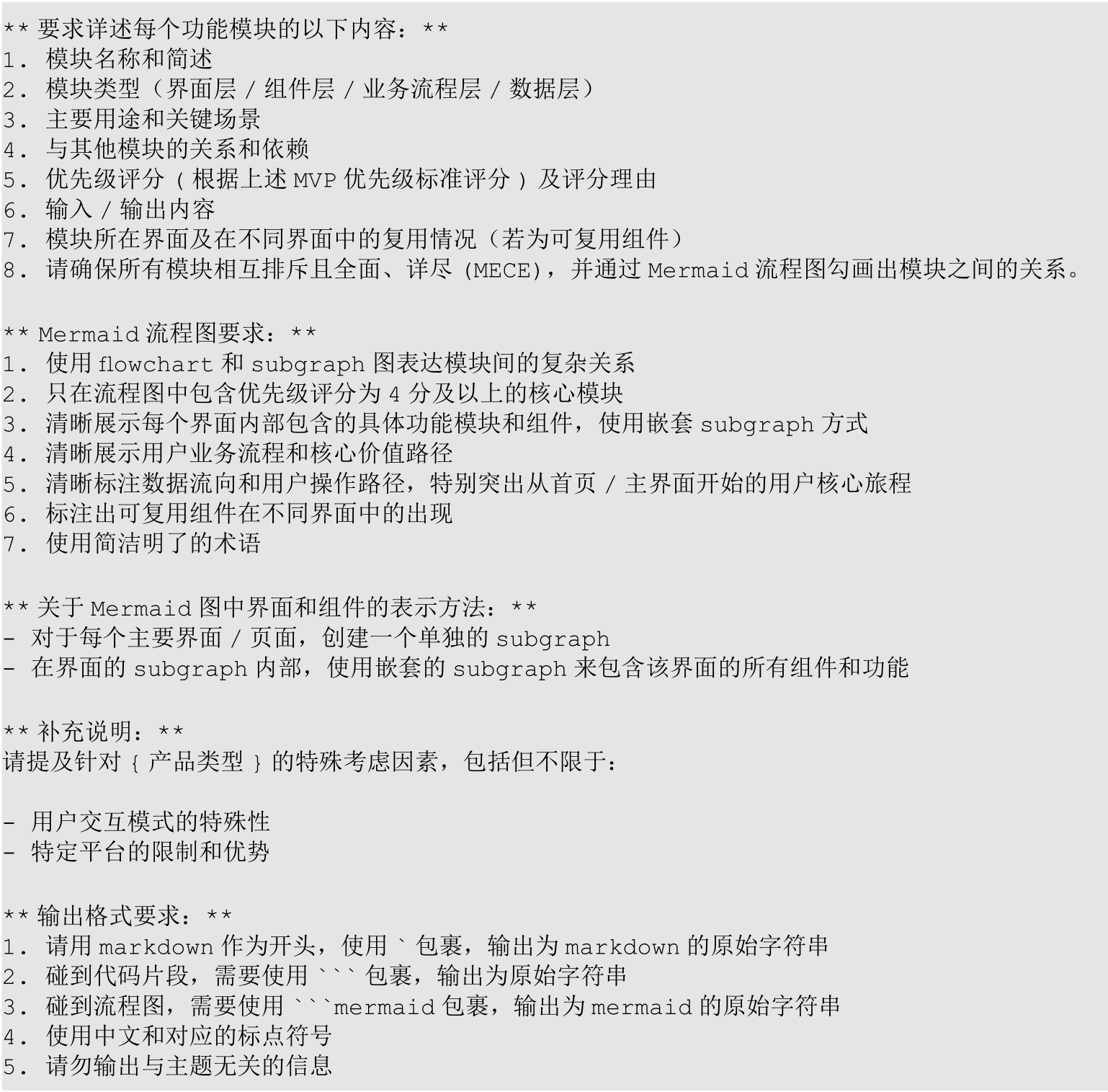 在AI辅助开发时代,我们不仅可以手动编写需求文档,还可以借助强大的LLM来生成完整的产品架构设计。这种方式能够大大缩短从创意到实现的时间,并提供专业水准的架构规划。