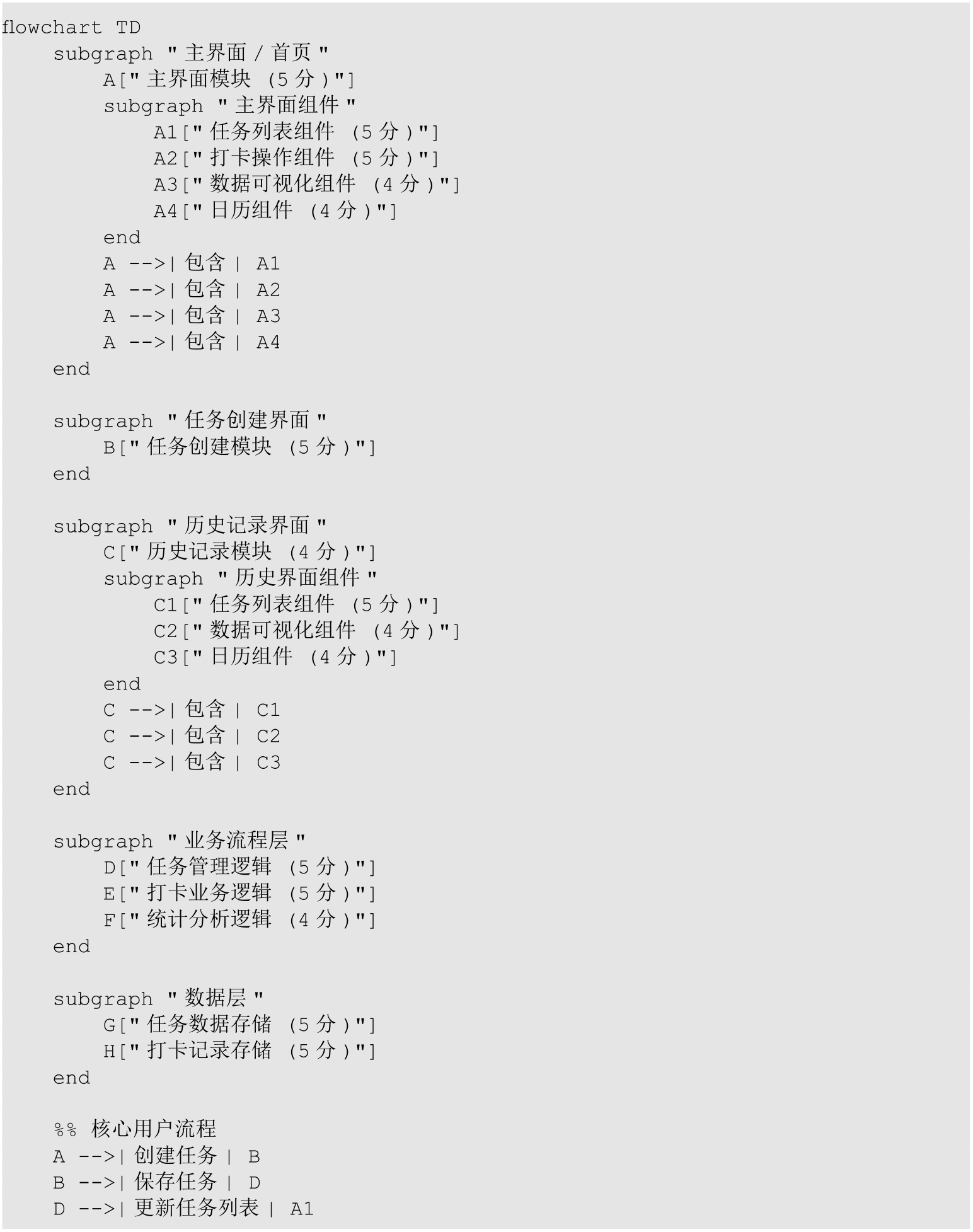 除此之外,可以直接将架构图复制给Lovable或者Cursor,它可以基于架构图将完整产品开发出来。以“每日打卡”应用为例,以下也是用该Prompt生成的产品架构Mermaid代码和使用Cursor一次性生成的产品效果链接,感兴趣的读者可以自行体验一下。