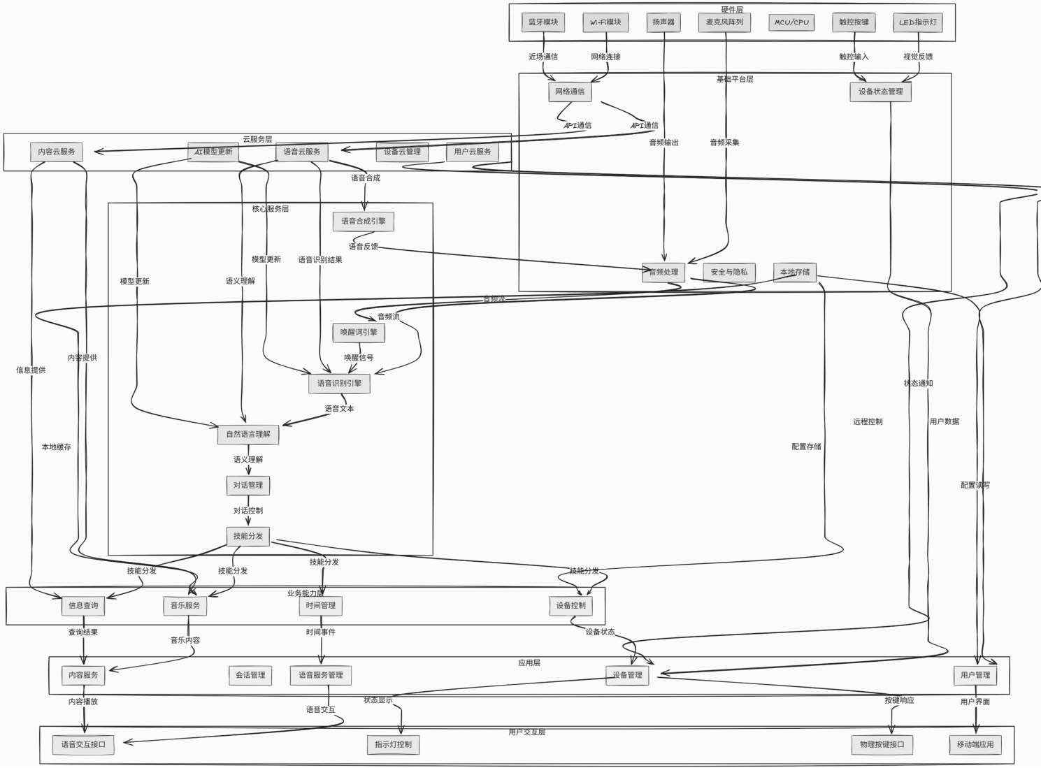 通过这个技术架构图,可以清晰地看到智能音箱从硬件到云服务的各个技术层级。