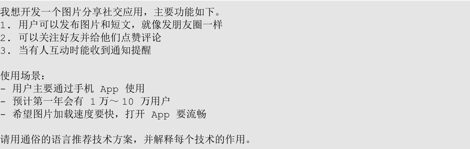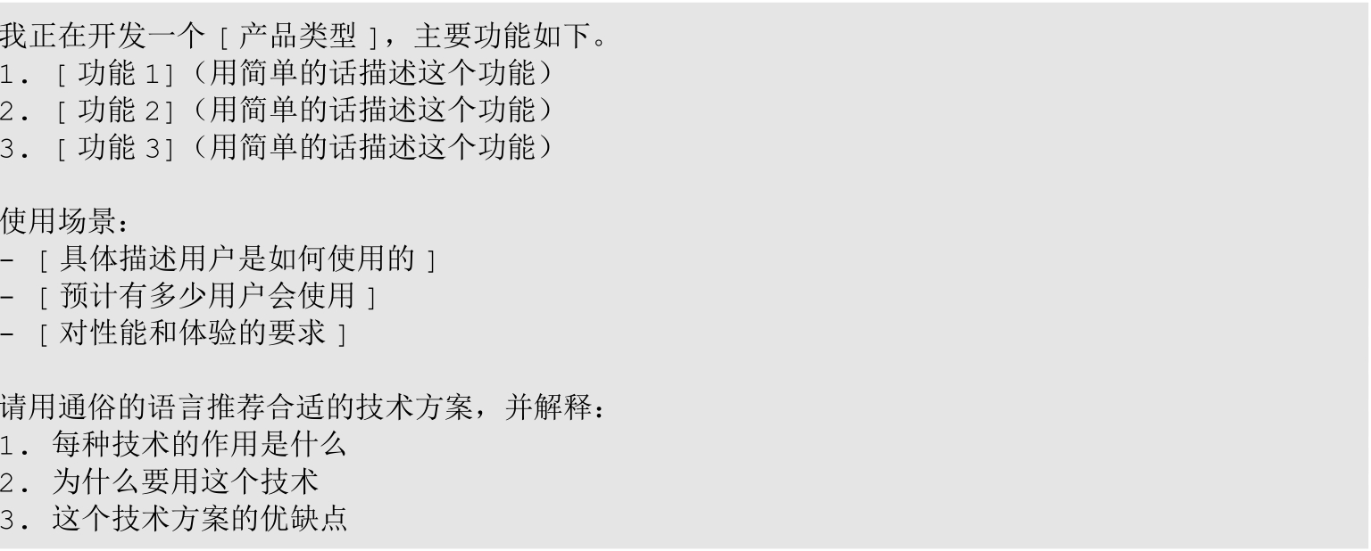 (4)技术选型参考:在选择具体技术实现时,可以针对架构图中的每个组件,咨询LLM哪些技术栈最适合实现它。