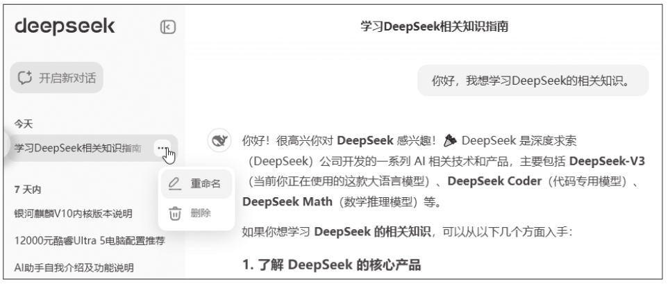 ③创建一个新的对话,如图1-9所示,并向DeepSeek询问一个问题。