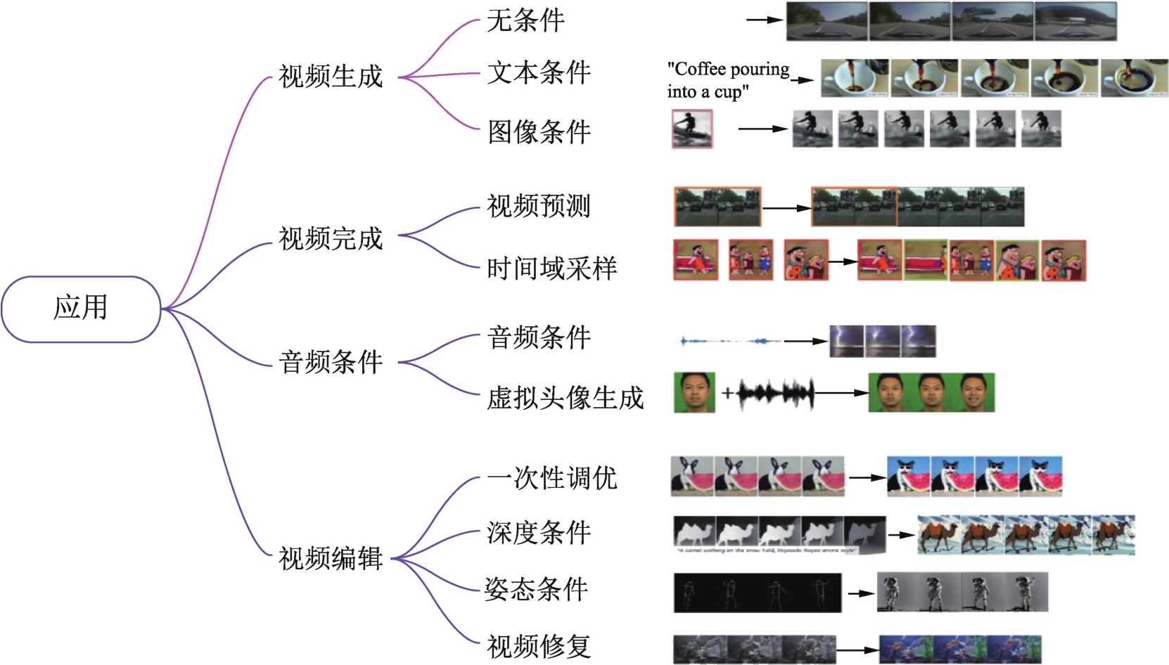 当前,基于扩散模型的AI视频拥有广泛的应用场景,除了最受关注的基于文字、图像、声音、视频等条件引导的视频生成之外,还包括视频补全、音频驱动的数字人视频、视频理解、视频编辑等,如图5-2所示。对于视频生成而言,视频编辑必不可少,比如去除视频中不希望出现的物体、将真实风视频转换为动漫风、使用运动笔刷让某个物体按指定轨迹动起来、使用局部重绘技术在视频中生成指定对象等,视频编辑使得视频生成更加灵活可控,从而更接近商业应用。
