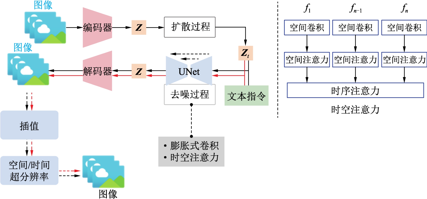 注:黑色箭头为训练流程,红色箭头为推理流程,右图为时空注意力
