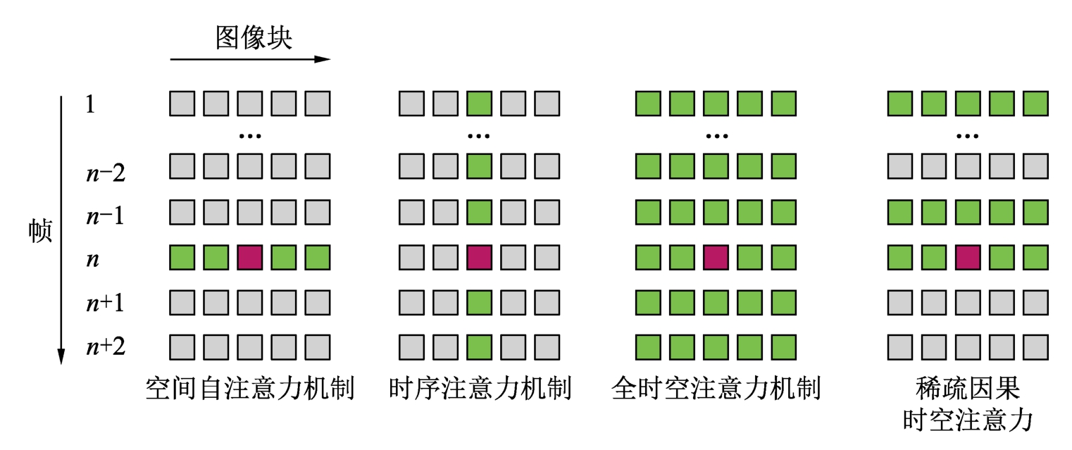 □ 在因果注意力(Causal Attention)中,查询块只会关注所有先前视频帧中的块;