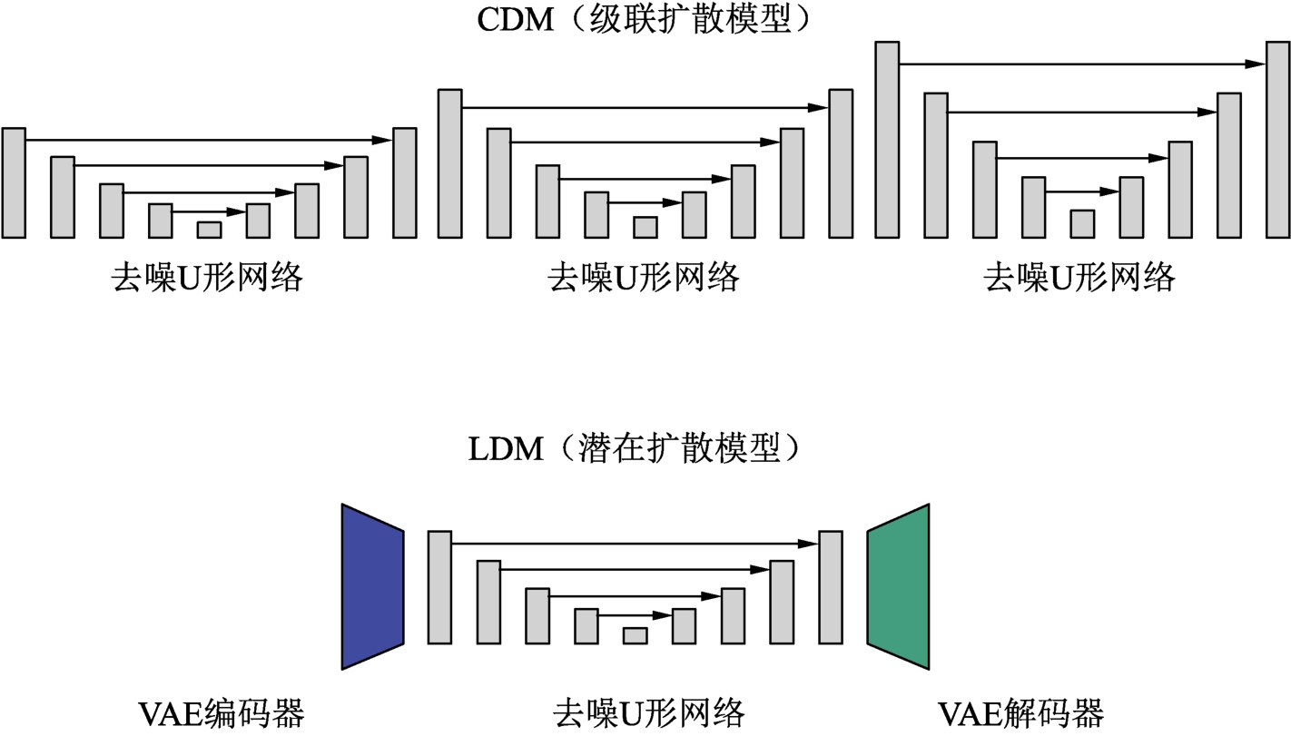 LDM是标准UNet架构的重要进展,现在已成为图像和视频生成任务的实际标准,如图5-6所示。