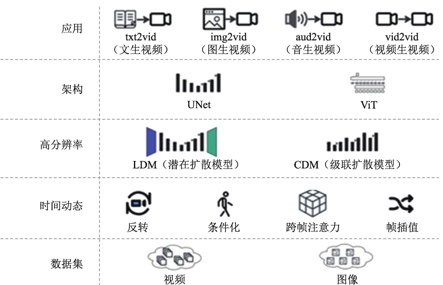 基于扩散模型的视频生成概念框架如图5-1所示。该框架展示了扩散模型下视频生成的潜在应用、可选架构、高分辨率技巧、时间动态建模机制和训练模式。