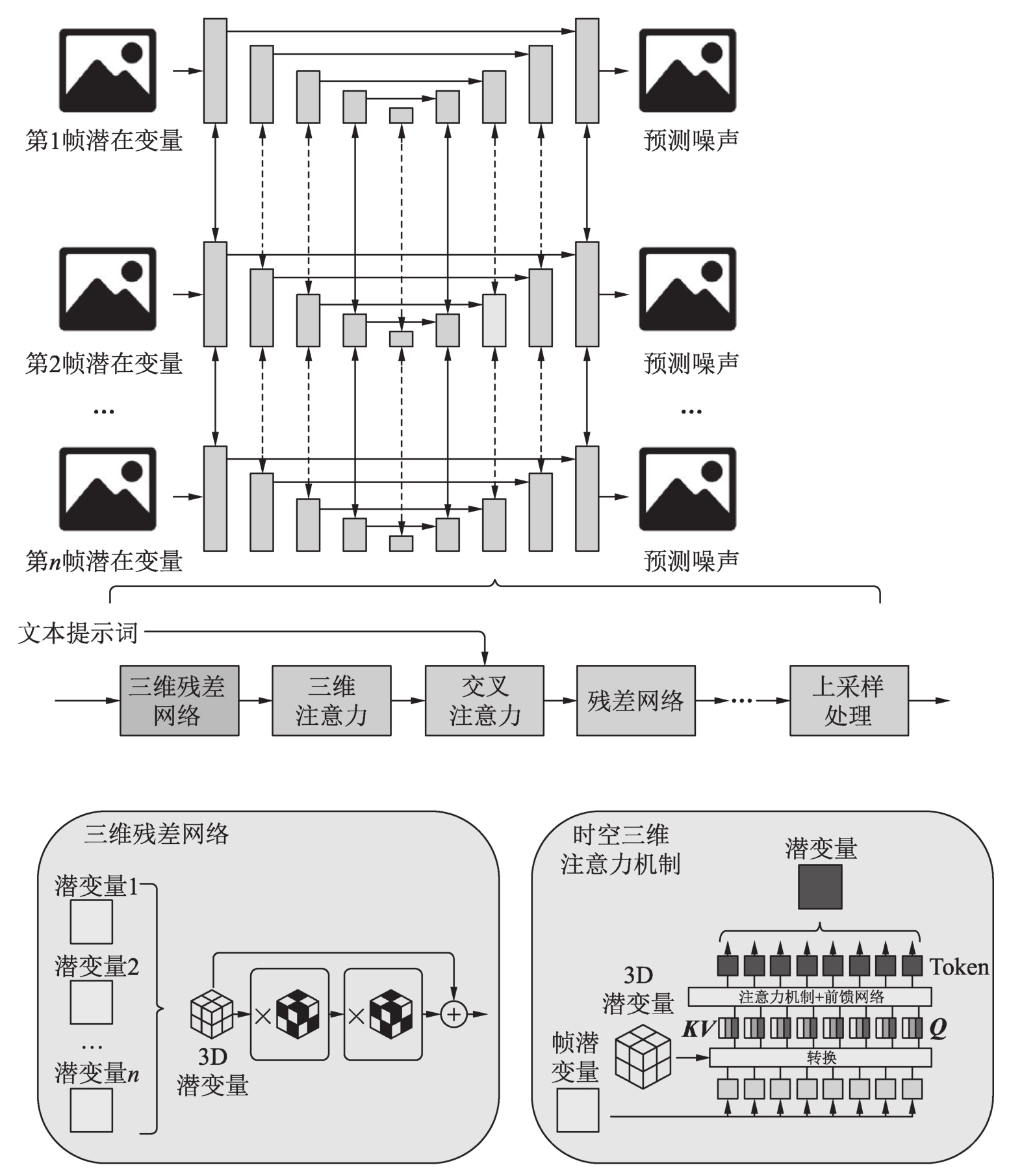 注入文本嵌入的噪声潜在表示 Z t 被发送到执行反向去噪过程的生成器中。通常使用具有跳过连接的UNet作为典型的生成器,以保留从编码潜在表示到解码潜在表示的空间信息。此UNet架构可执行修改以适应视频的时间维度,通过这些修改,UNet能够更好地处理视频数据,生成时间上连贯的结果。