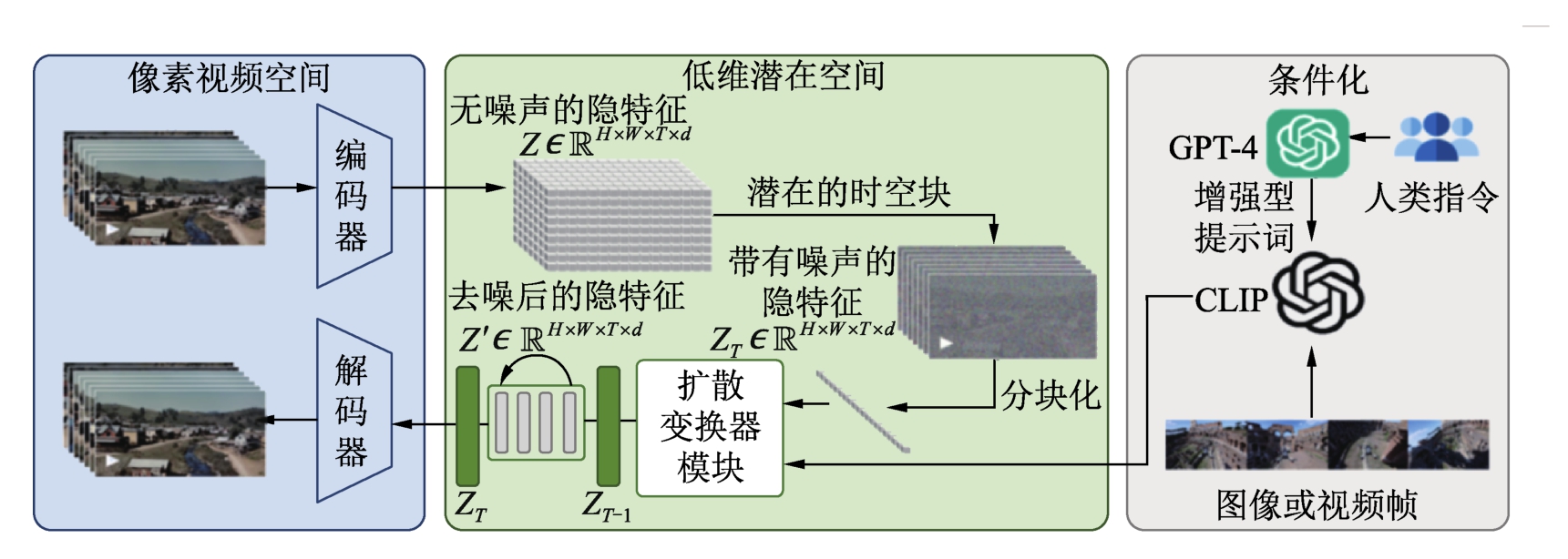 2024年初,OpenAI正式宣布推出文本生成视频的大模型——Sora,其结构如图6-2所示。Sora能够根据简单的文本描述生成出高达60秒的高质量视频,这让视频创作变得前所未有的简单和高效。