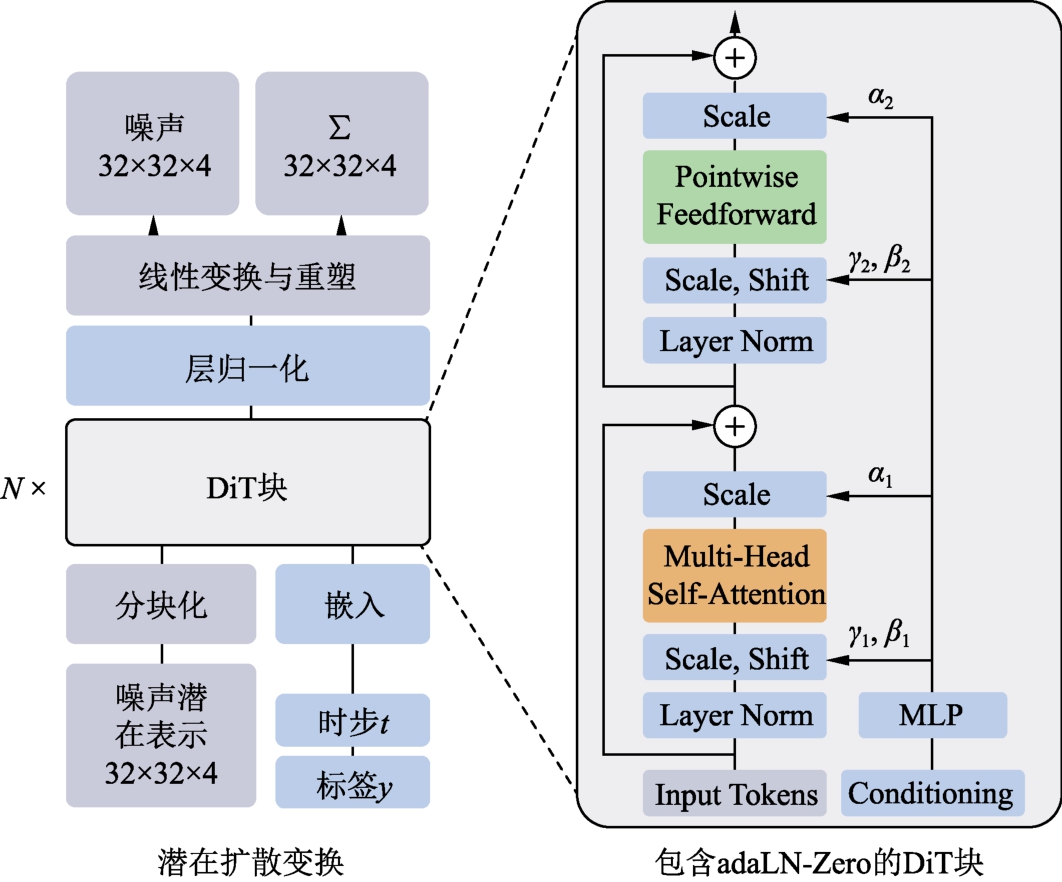 通过引入不同的块设计如自适应层归一化(adaLN)和adaLN-zero,以及优化条件化机制,DiT进一步提高了图像的生成质量和模型的稳定性。特别是adaLN-zero通过将每个DiT块初始化为恒等函数,显著提高了模型性能。