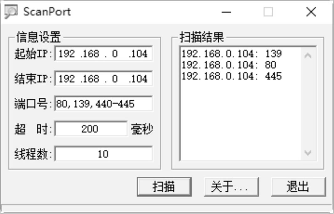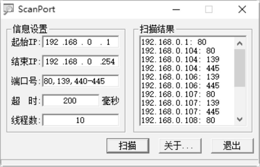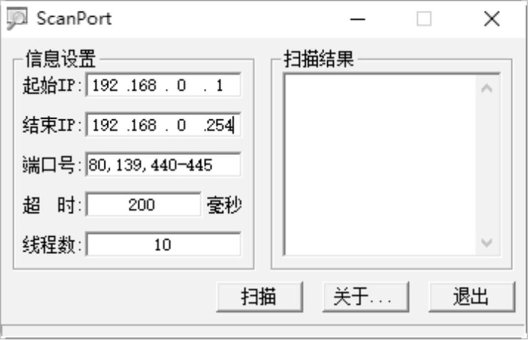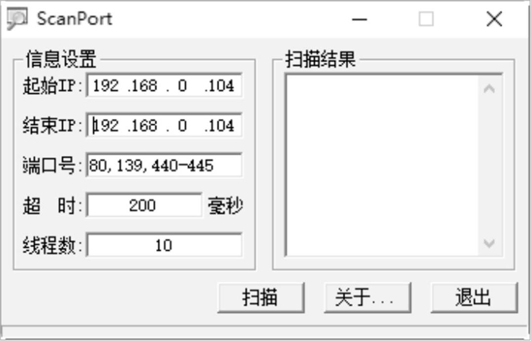 步骤 01 下载并运行ScanPort程序,打开“ScanPort”主窗口,在其中设置起始IP、结束IP及要扫描的端口号,如图2-1所示。