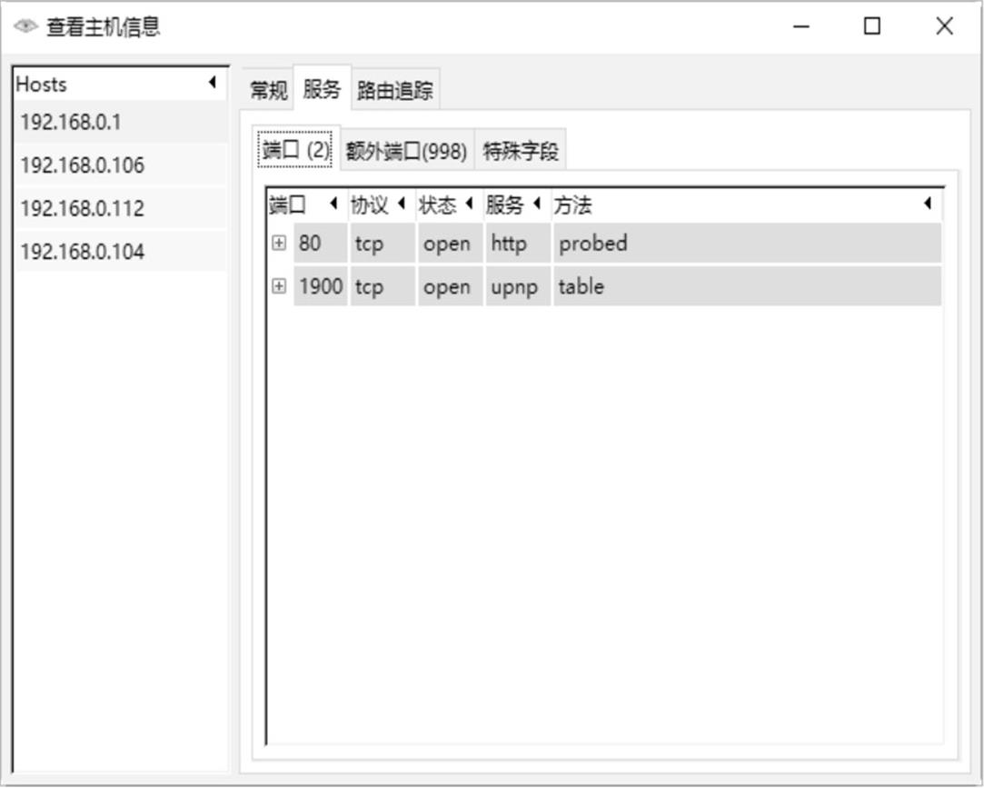 步骤 08 在“查看主机信息”窗口中选择“服务”选项卡,可以查看当前主机的服务信息,如端口、协议、状态等,如图2-20所示。