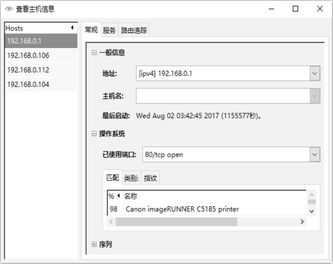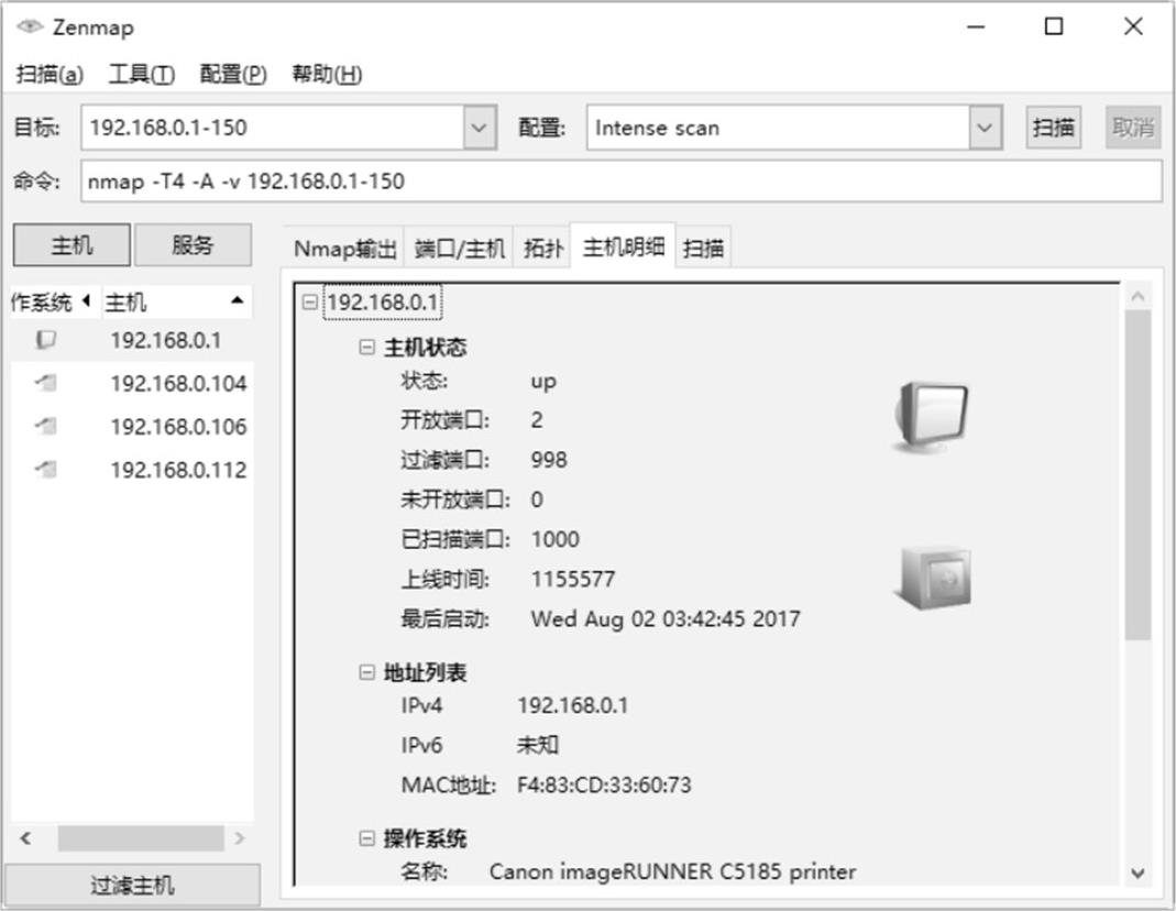 步骤 10 在Nmap操作界面中选择“主机明细”选项卡,在打开的界面中可以查看当前主机的明细信息,包括主机状态、地址列表、操作系统等,如图2-22所示。