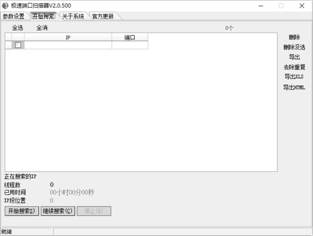 步骤 01 下载并运行“极速端口扫描器V2.0.500”,打开“极速端口扫描器”主窗口,如图2-5所示。
