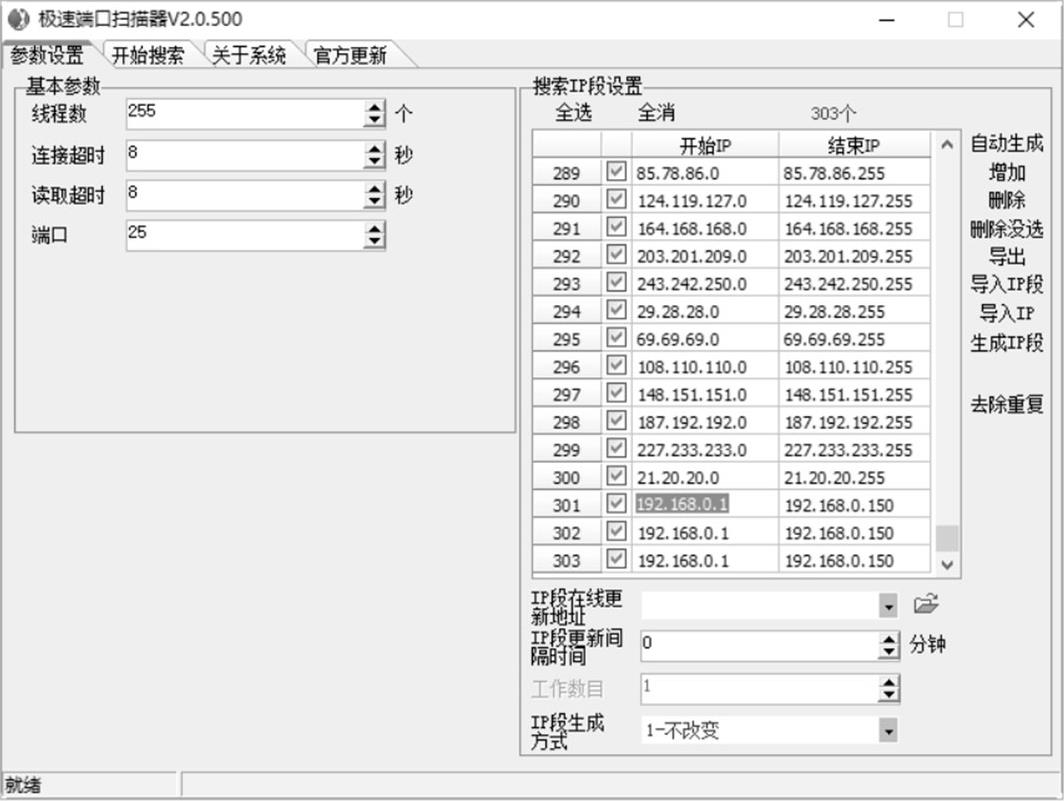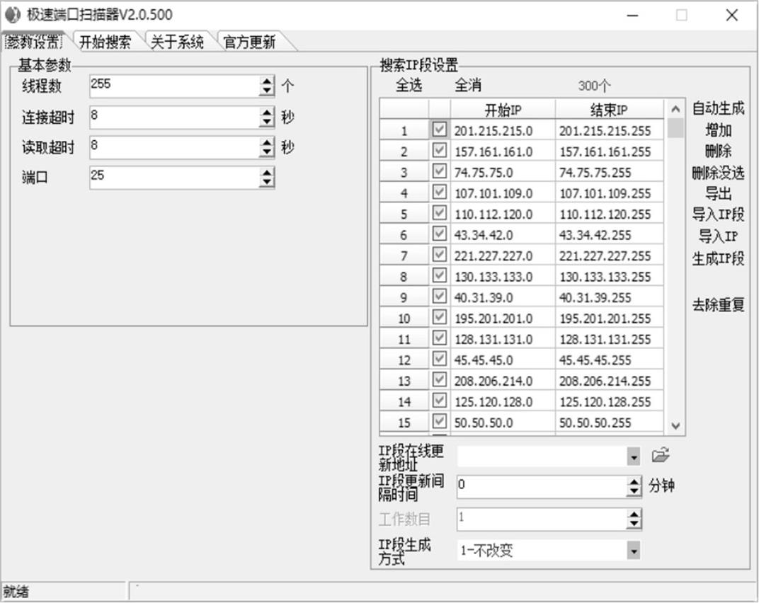 步骤 02 选择“参数设置”选项卡,在其中可以看到该工具自带的IP地址段及各种参数,如图2-6所示。