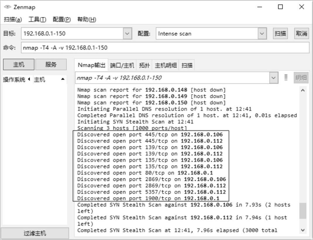 步骤 04 单击“扫描”按钮开始扫描,稍等一会儿,将在“Nmap输出”选项卡中显示扫描信息,在其中可以看到扫描对象当前开放的端口,如图2-16所示。