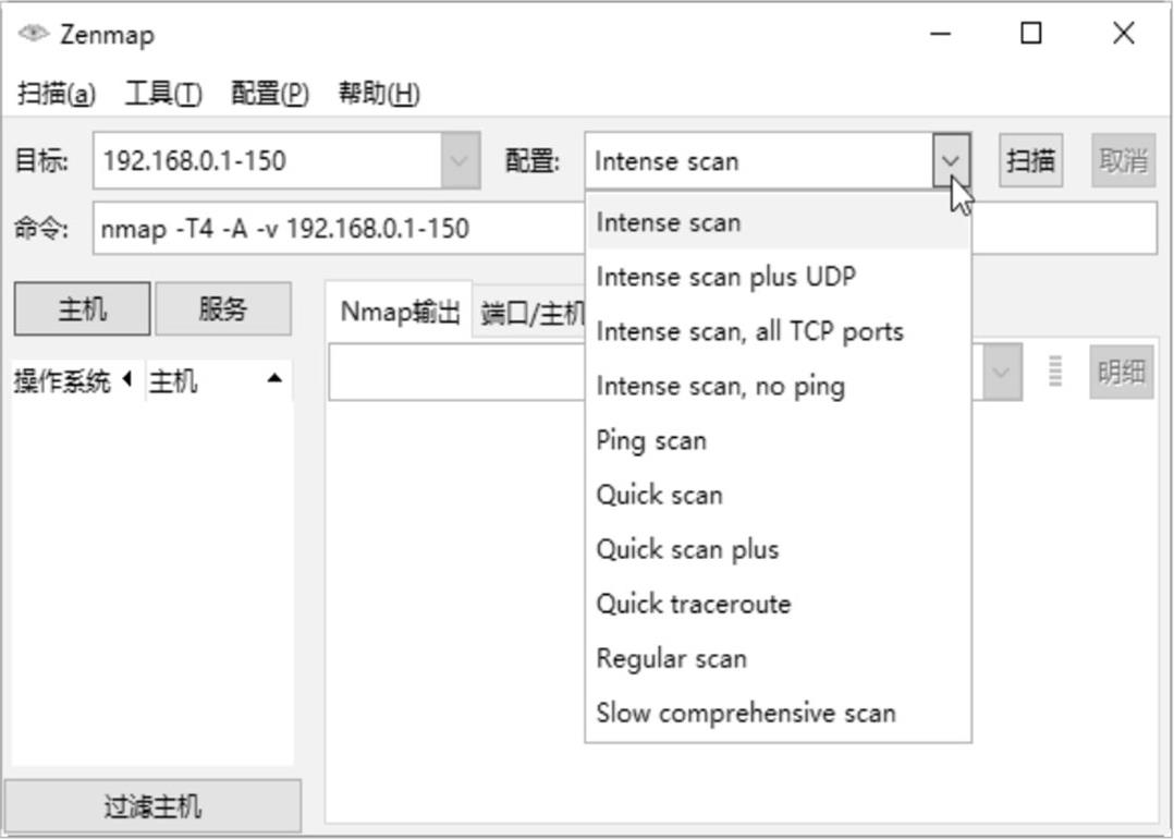 步骤 03 设置网络扫描的不同配置文件,可以单击“配置”下拉按钮,在打开的下拉列表框中选择Intense scan、Intense scan plus UDP、Intense scan, all TCP ports等选项,从而对网络主机进行不同方面的扫描,如图2-15所示。