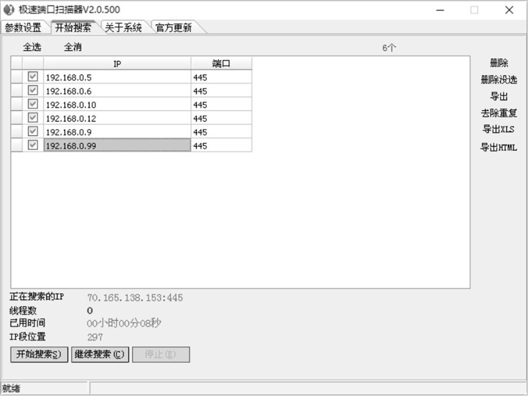 步骤 06 设置完毕后,选择“开始搜索”选项卡,单击“开始搜索”按钮,将扫描指定的IP段,最终的扫描结果如图2-10所示。