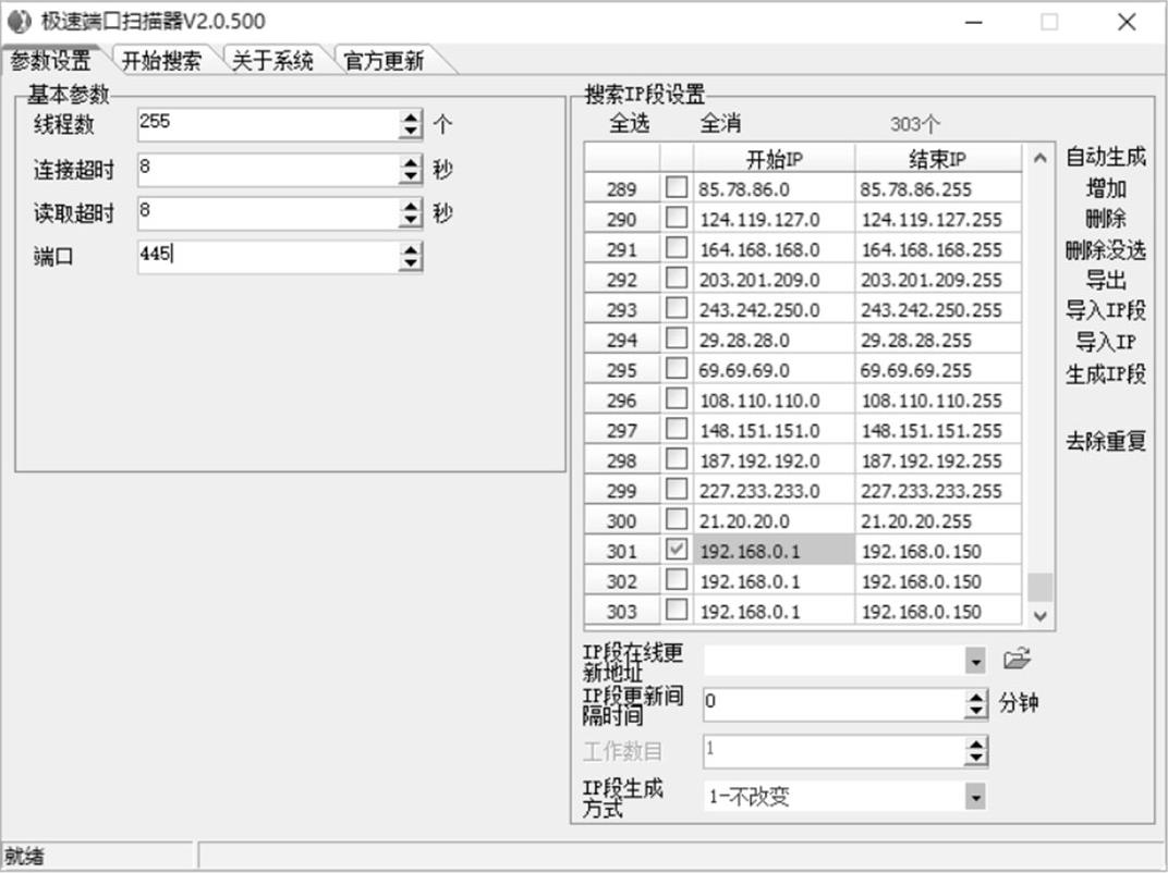 步骤 05 单击“全消”按钮,即可取消选择所有的IP段,然后选择刚添加的IP段,并将要扫描的端口设置为445,如图2-9所示。
