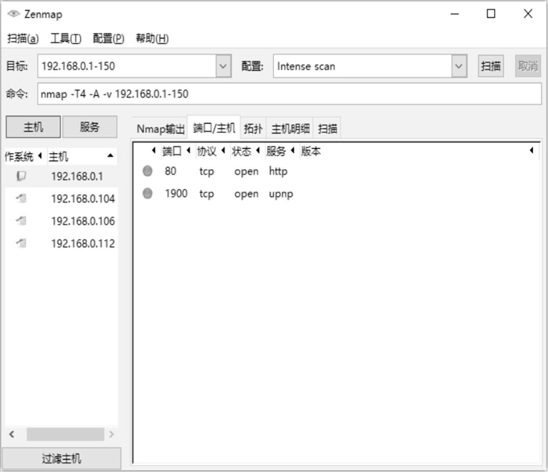 步骤 02 单击“扫描”按钮,开始扫描,从扫描结果中可以看出设置的IP地址段中计算机开启的端口,如图2-2所示。