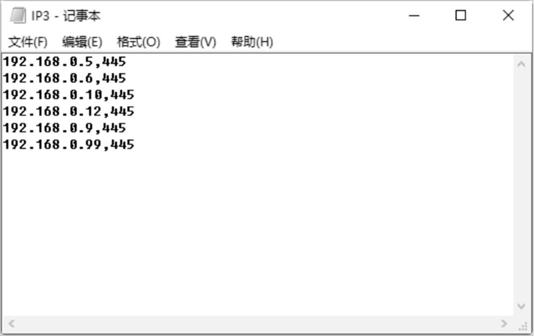 步骤 08 设置完保存名称和路径后,单击“保存”按钮,即可将扫描结果保存为记事本文件格式。打开保存的搜索结果,在其中即可看到搜索到的IP地址及搜索的端口,如图2-12所示。
