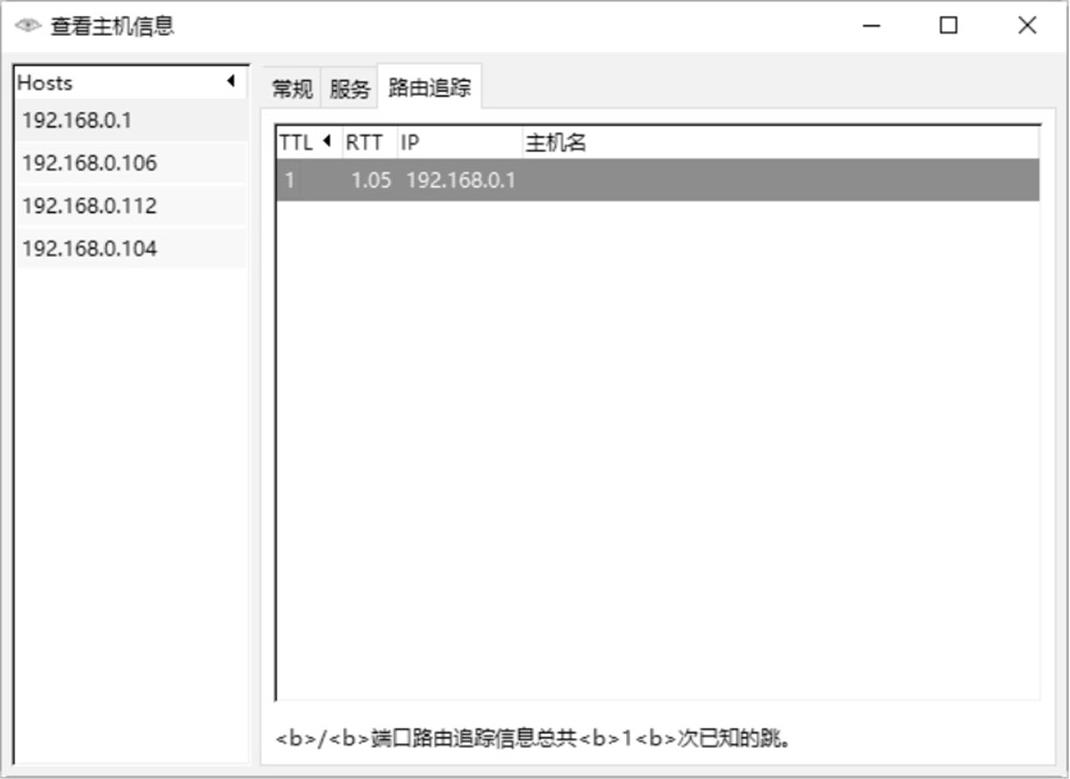 步骤 09 选择“路由追踪”选项卡,在打开的界面中可以查看当前主机的路由器信息,如图2-21所示。
