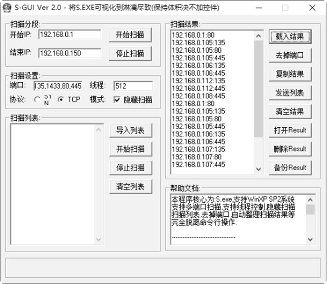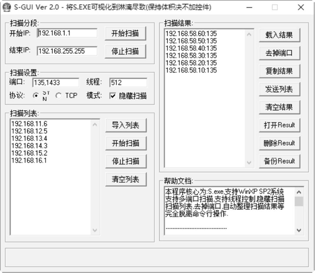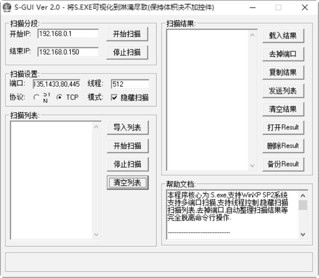 S-GUI Ver扫描器是以S.EXE为核心的可视化端口扫描工具,该工具支持多端口扫描、线程控制、隐藏扫描、扫描列表、去掉端口、自动整理扫描结果等,是一款使用起来比较方便的端口扫描工具。