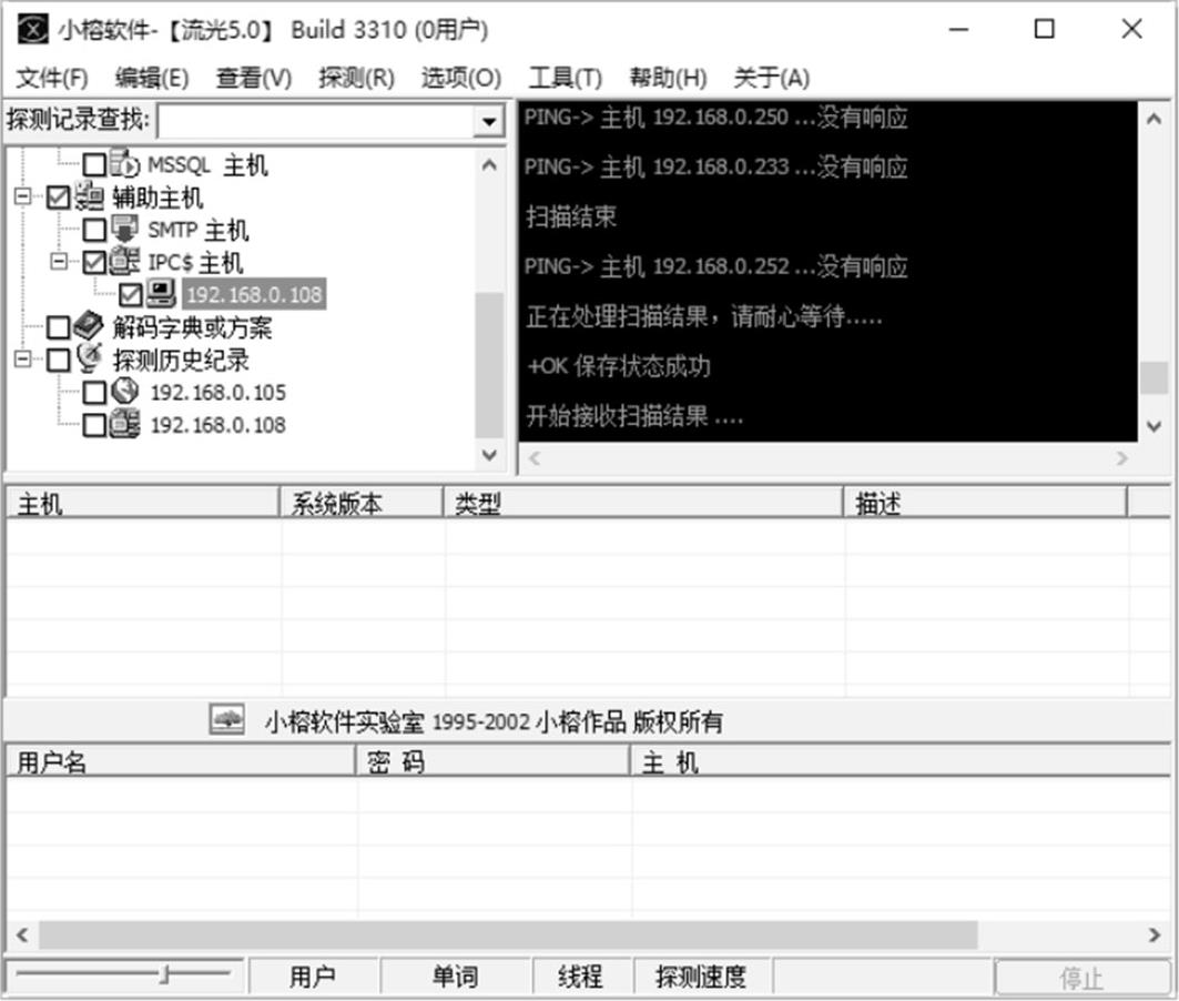 利用IPC$可以与目标主机建立一个空的连接,利用这个空的连接,连接者可以获得目标主机上的用户列表,通过猜测密码或者穷举密码,从而获得管理员权限。利用流光扫描器探测目标主机的IPC$用户列表的具体操作方法如下: