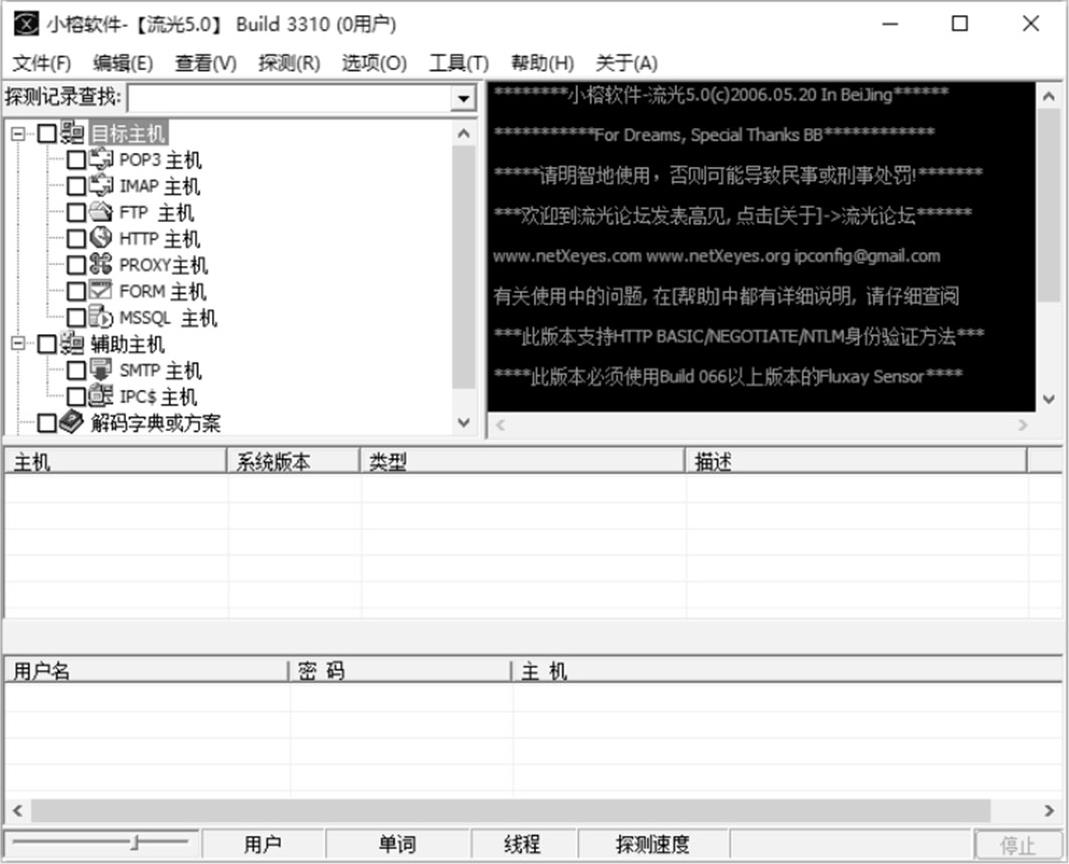流光扫描器是一款非常出名的中文多功能专业扫描器,其功能强大,扫描速度快,可靠性强。流光扫描器还可以探测POP3、FTP、HTTP、SQL等各种漏洞,并为不同的漏洞设计不同的破解方案。