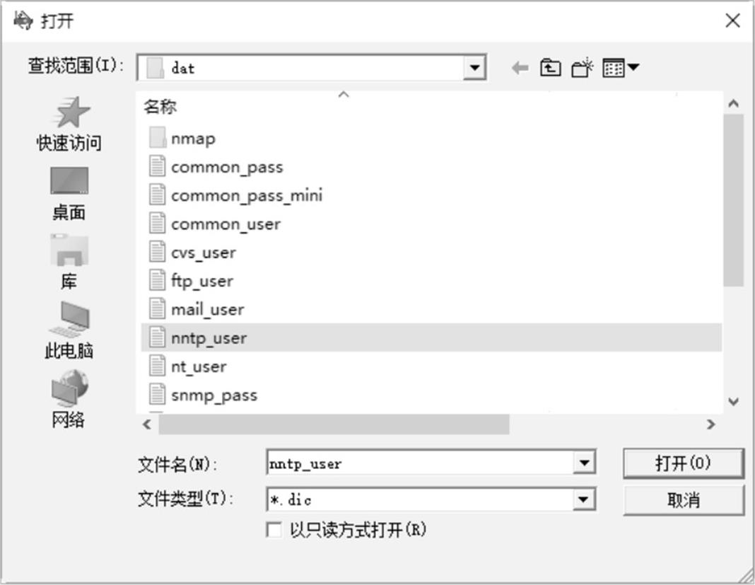 步骤 15 在其中选择相应的字典文件后,单击“打开”按钮,返回“扫描参数”对话框,即可完成字典文件的添加操作。设置好所有选项后,单击“确定”按钮,即可完成设置,如图2-60所示。