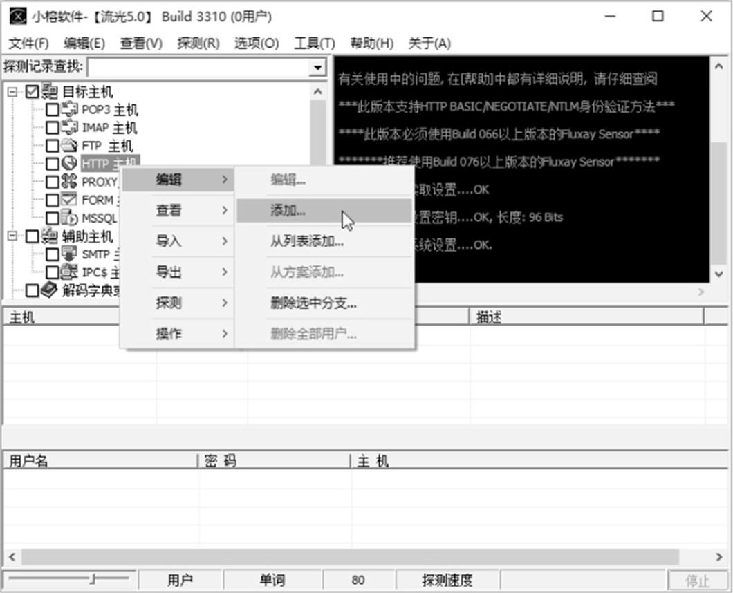 步骤 03 在扫描器主窗口中选择“HTTP主机”复选框,然后右击,在弹出的快捷菜单中选择“编辑”→“添加”命令,如图2-25所示。
