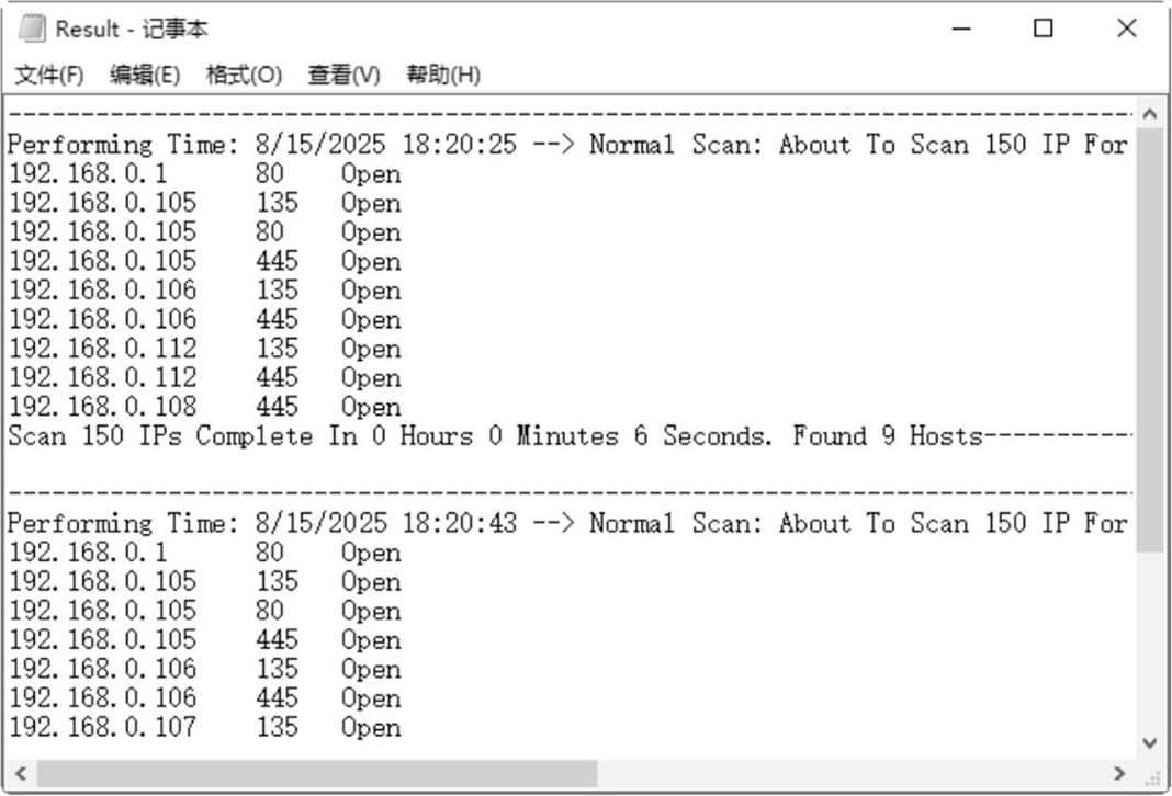 步骤 10 单击“打开Result”按钮,将以记事本的形式打开“Result”记事本文件,在其中可以看到具体的扫描信息,如图2-73所示。