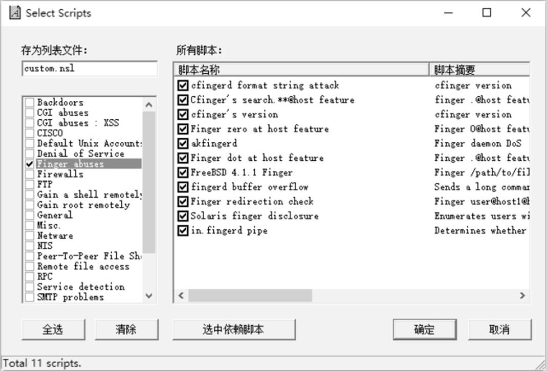 步骤 11 选择“漏洞检测脚本设置”子选项,取消选择“全选”复选框后,单击“选择脚本”按钮,弹出“Select Scripts(选择脚本)”对话框,如图2-56所示。