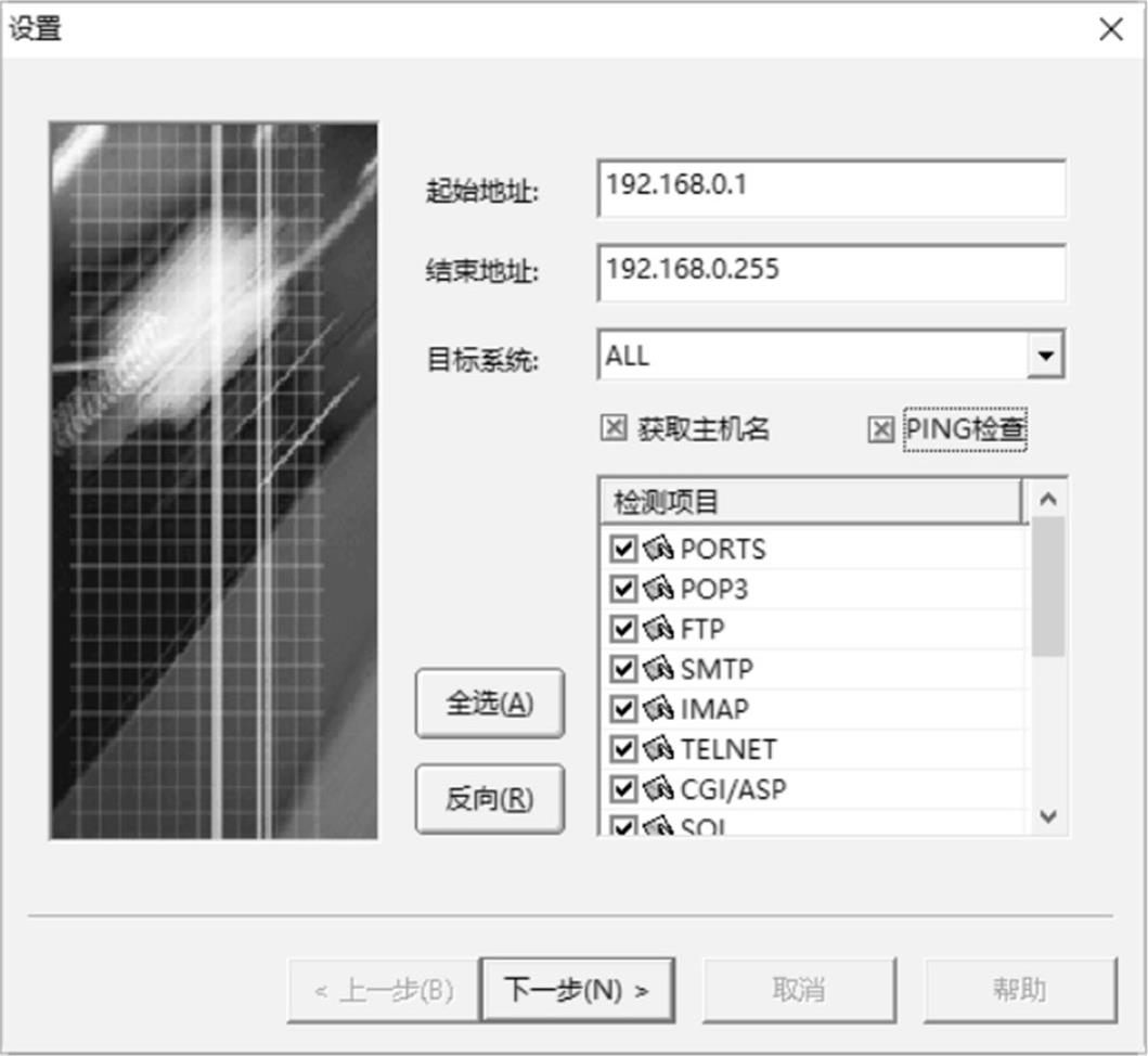 步骤 02 弹出“设置”对话框,在“起始地址”和“结束地址”文本框中分别输入指定地址范围的开始和结束IP地址,并选择“获取主机名”和“PING检查”复选框,如图2-38所示。